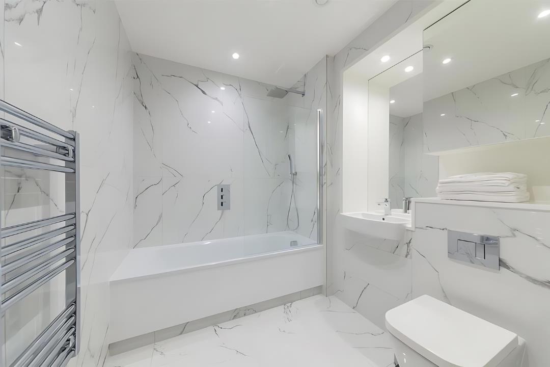 The bathroom is finished with large-format marble-style tiles and includes a bathtub with a shower screen and rain shower overhead, combining style with everyday practicality.