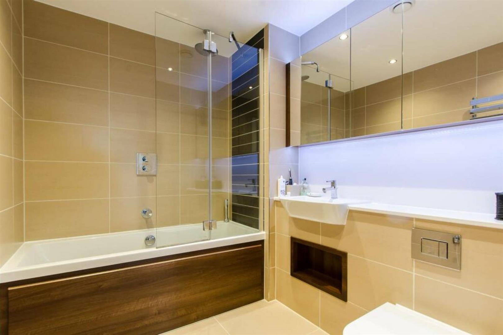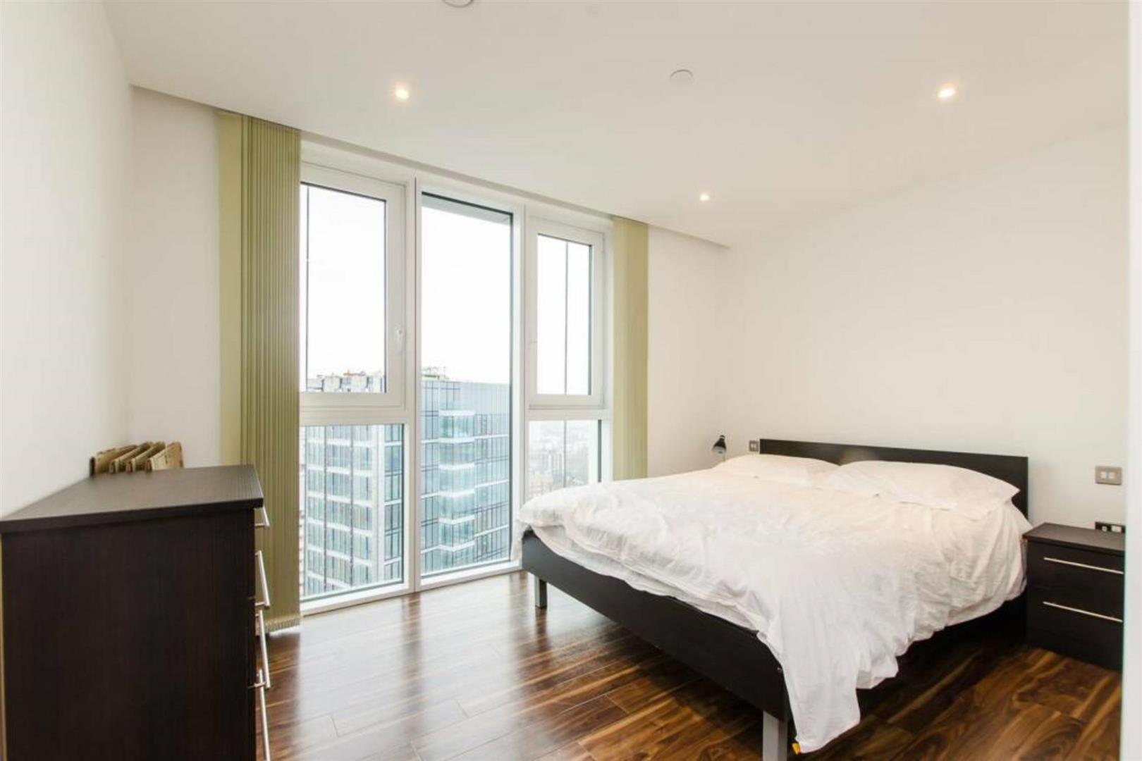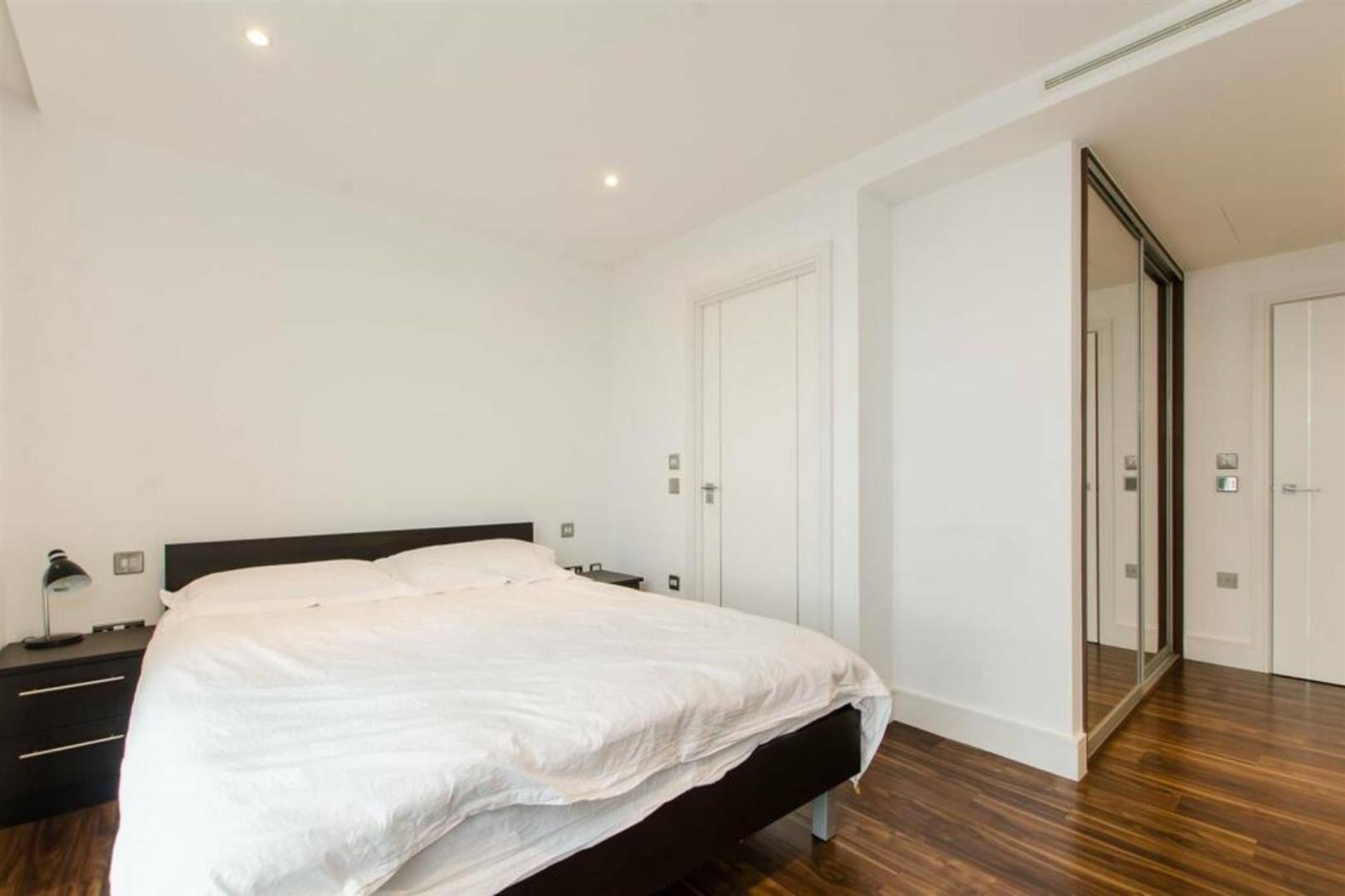 The apartment boasts a spacious open-plan reception and dining area, where the elegant wood flooring is complemented by large windows that flood the room with natural light. This creates an impressive sense of space and provides direct access to a private balcony, perfectly positioned to capture far-reaching views across the iconic London skyline.