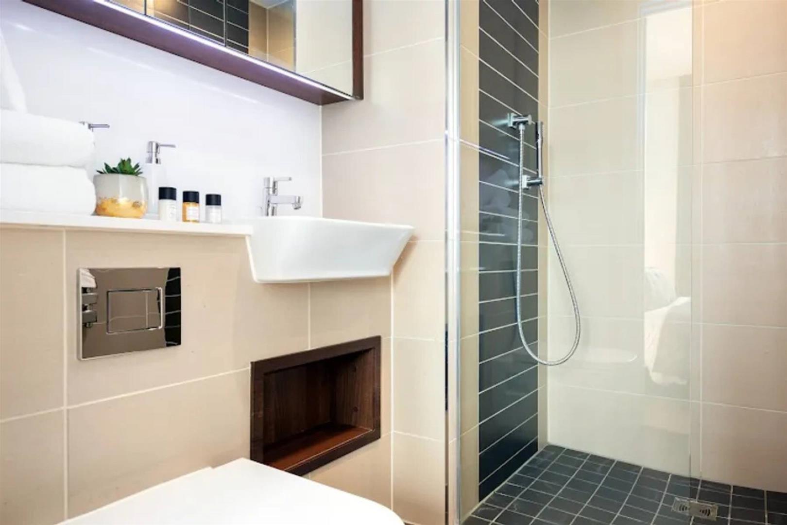 Both bedrooms are generously sized and continue the high-end finish with wood flooring underfoot. The principal bedroom benefits from ample built-in storage and a sleek, modern en-suite bathroom, while the second bedroom is served by a well-appointed family bathroom.