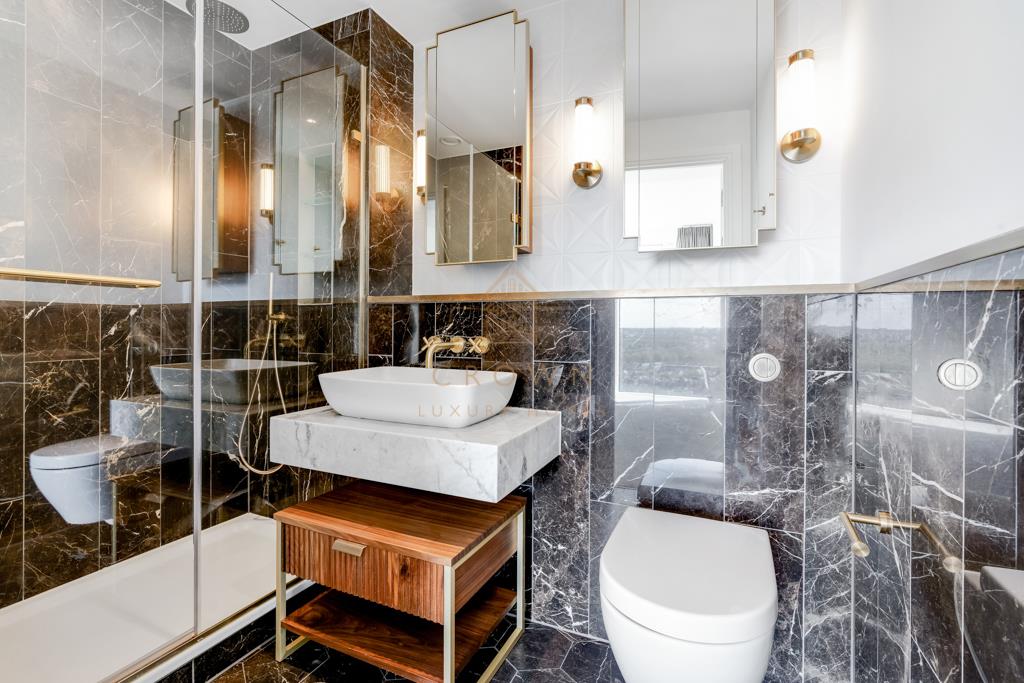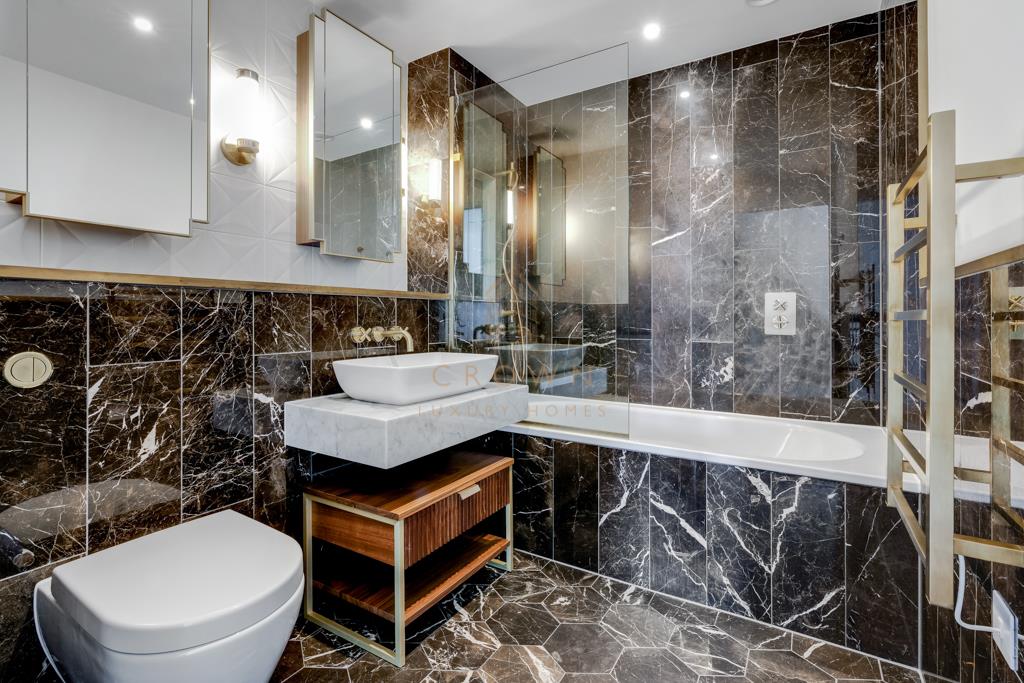 The bathrooms are finished to an exceptional standard, combining walk-in showers, a bathtub, mirrored storage units, brushed brass fixtures, and classic black-and-white tiling. Every detail throughout the apartment reflects a design inspired by Chelsea’s rich heritage of art, fashion, and craftsmanship.