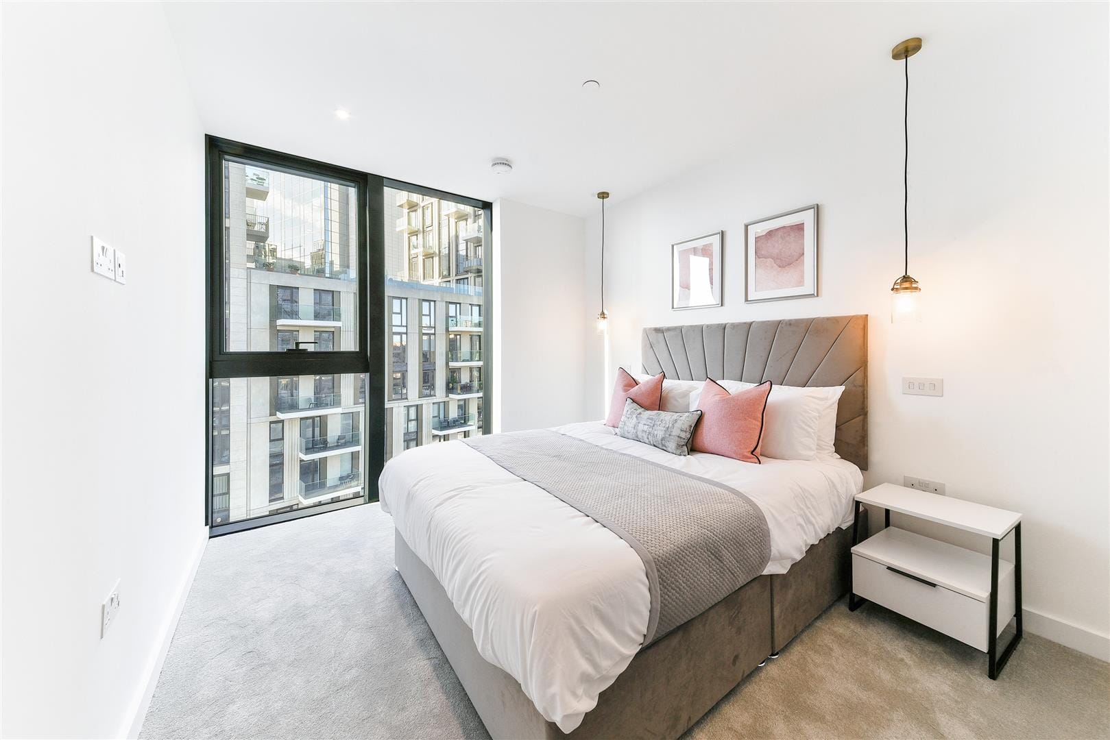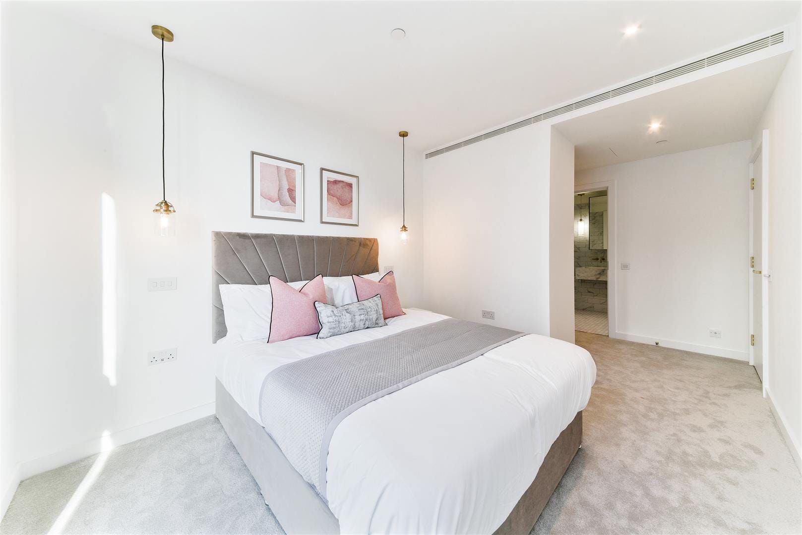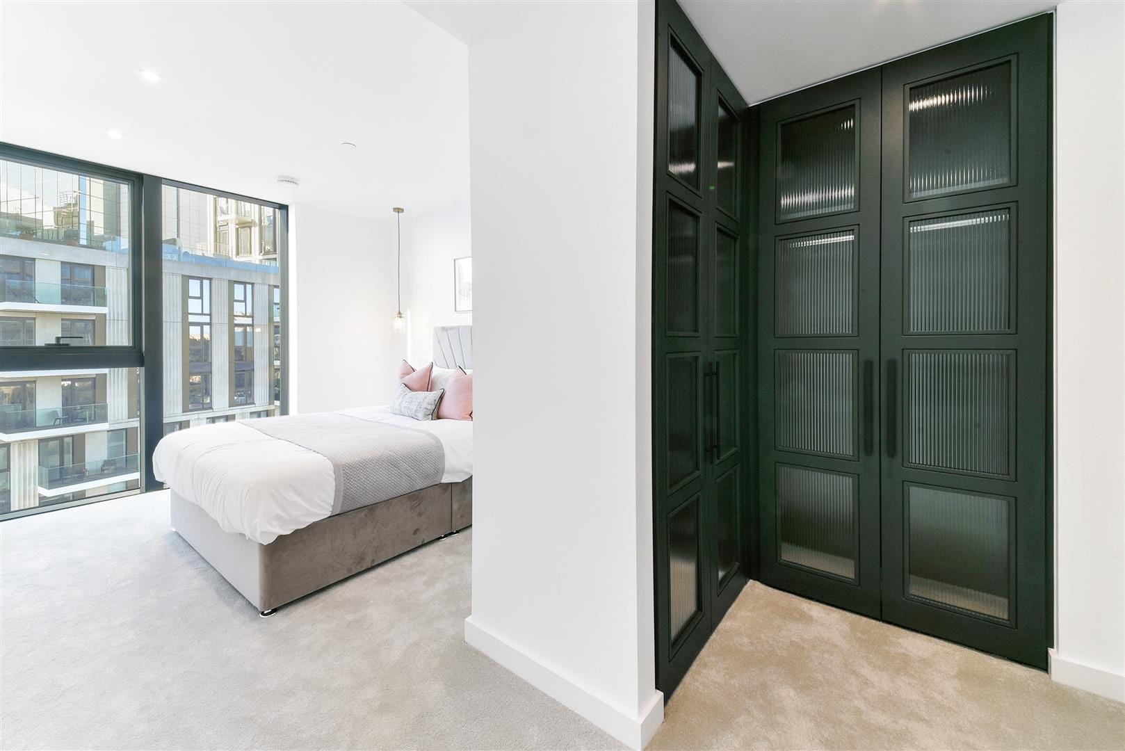 The bedroom includes carpet and floor-to-ceiling windows. Its comfortable atmosphere fits in wonderfully with the overall vibe of modern, easy-going appeal. The bedroom has its own stylish en suite with a bath, brushed-gold fixtures, and a trendy, tiled finish, ideal for welcoming you once you wake up each morning.