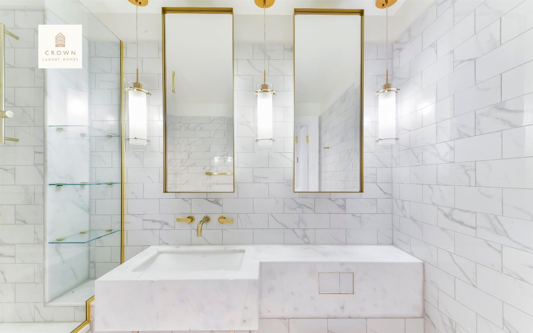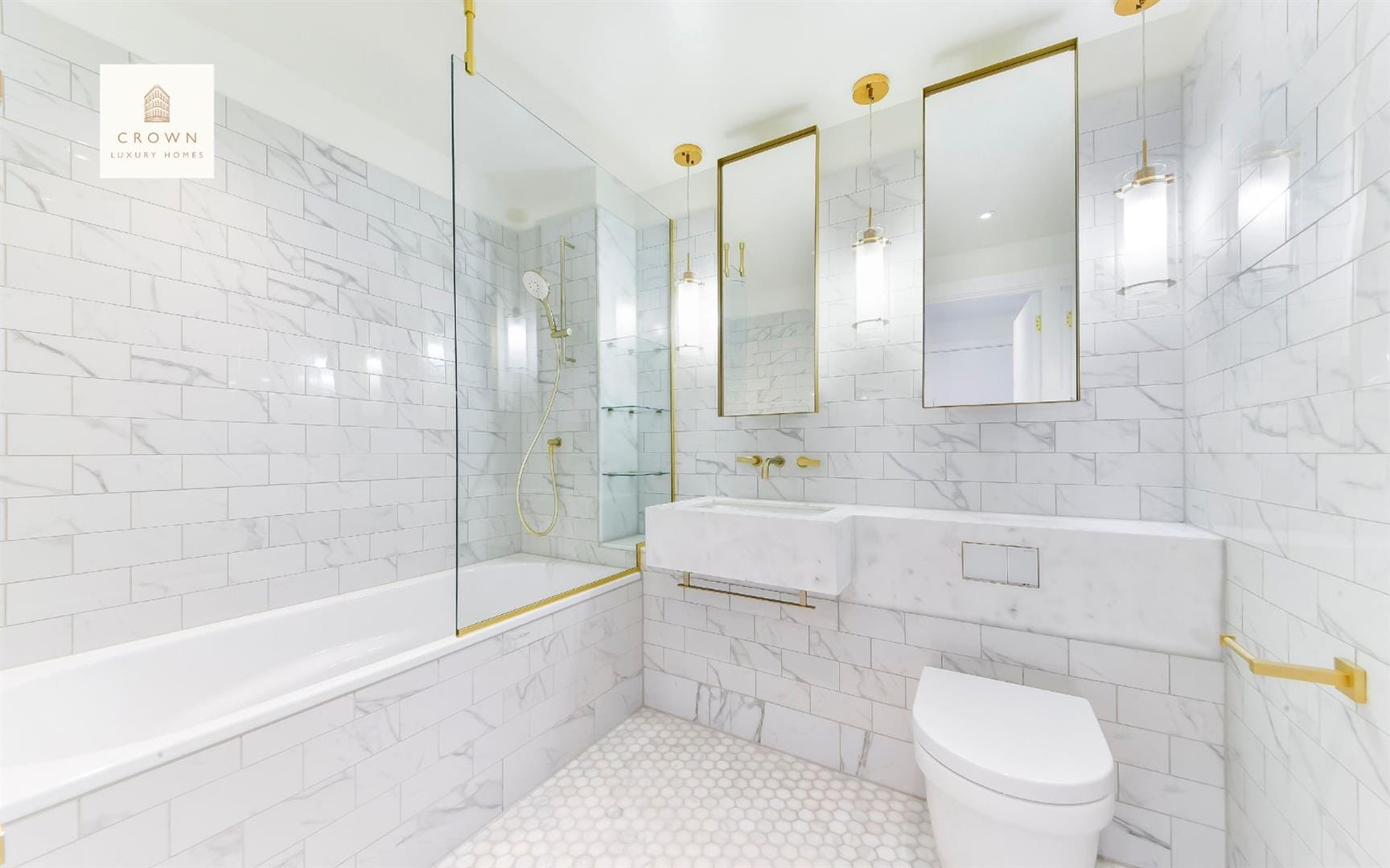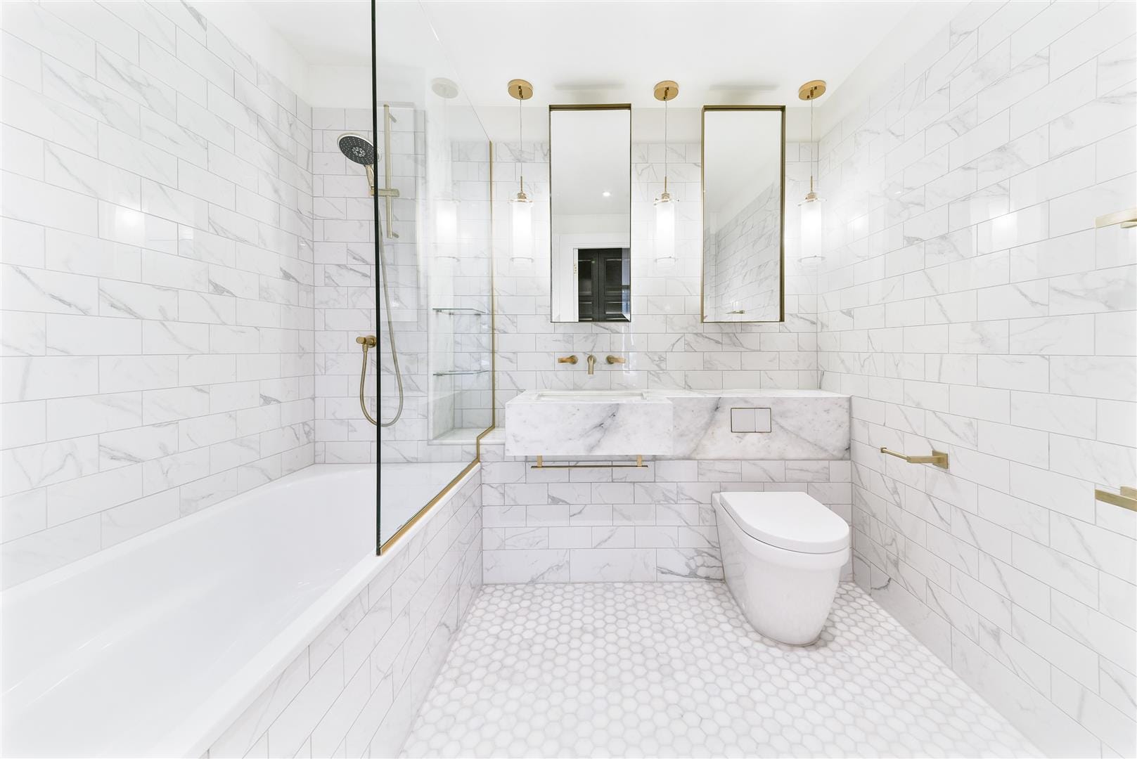 The bedroom includes carpet and floor-to-ceiling windows. Its comfortable atmosphere fits in wonderfully with the overall vibe of modern, easy-going appeal. The bedroom has its own stylish en suite with a bath, brushed-gold fixtures, and a trendy, tiled finish, ideal for welcoming you once you wake up each morning.