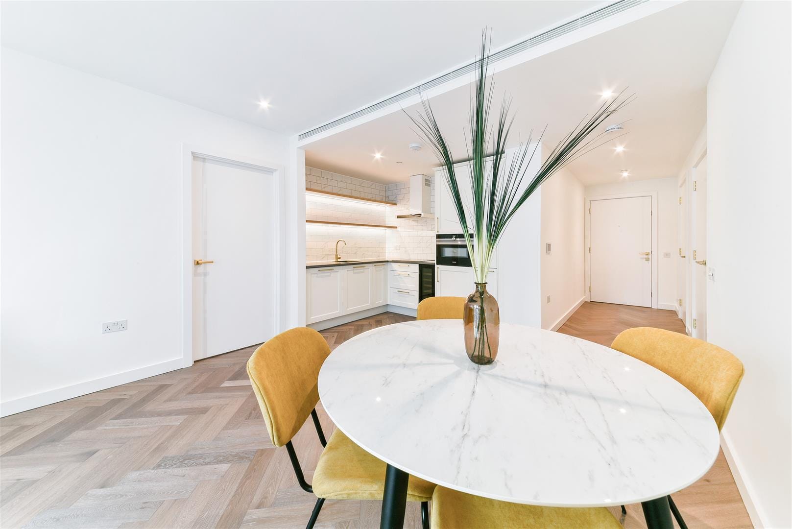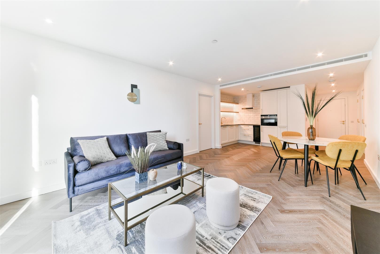 The living room features classic herringbone flooring and plenty of light, giving it a vivid, effervescent aspect, making it a fantastic location to spend that all-important leisure.
