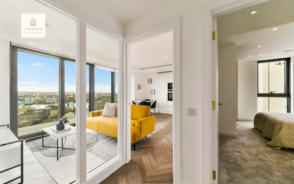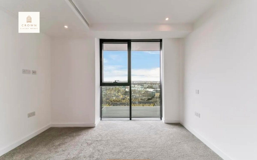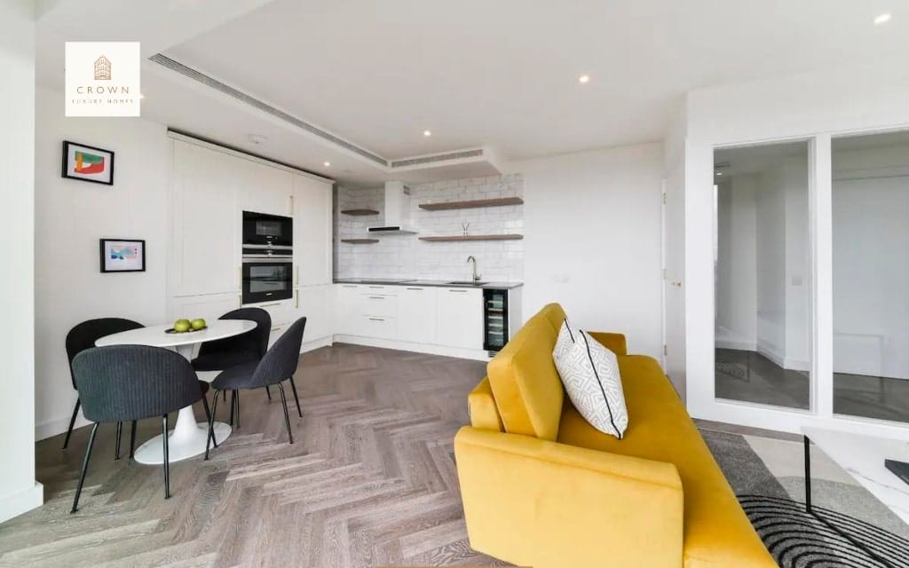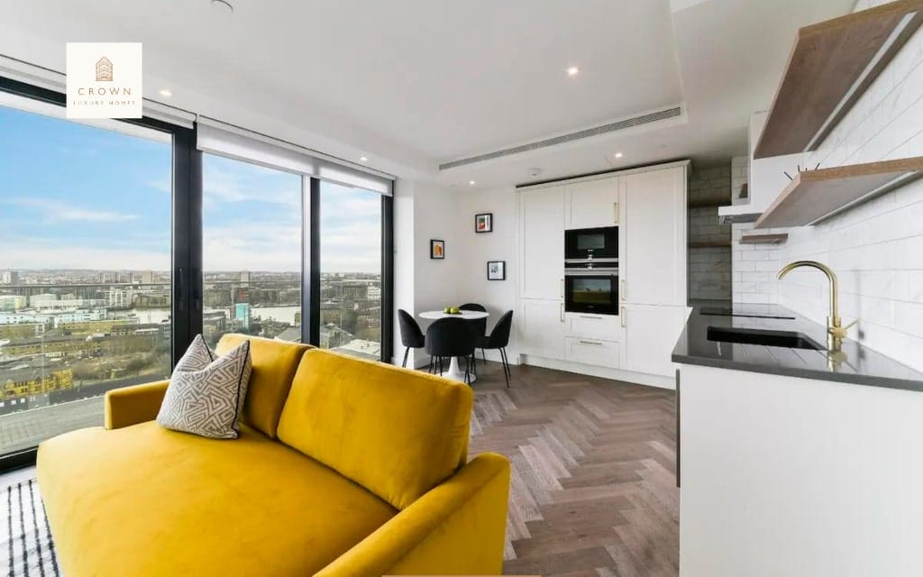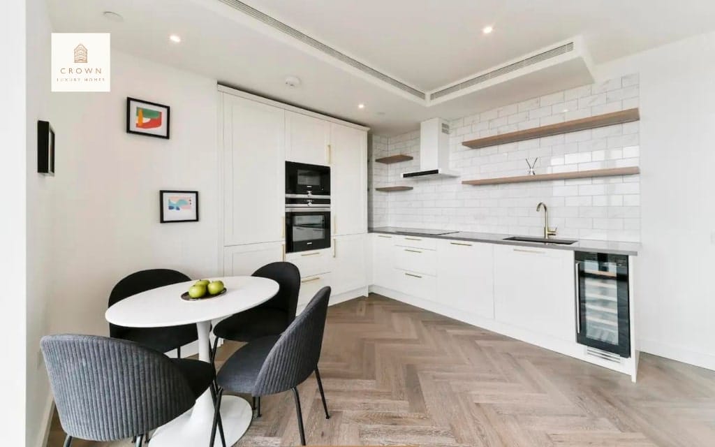 The expansive open living area seamlessly extends to a substantial balcony, providing sweeping views of the city, Shard, Canary Wharf, and Tower Bridge. This contemporary apartment is characterised by its distinctive features. The modern L-shaped kitchen is equipped with integrated appliances, including a Siemens induction hob, a wine fridge, a dishwasher, and a fridge/freezer. Noteworthy details such as gold-ironmongery fixtures and composite stone worktops contribute to an elegant aesthetic. The thoughtful integration of these elements results in a dynamic composition that optimally utilises light and space, creating a residence conducive to comfort and flourishing.