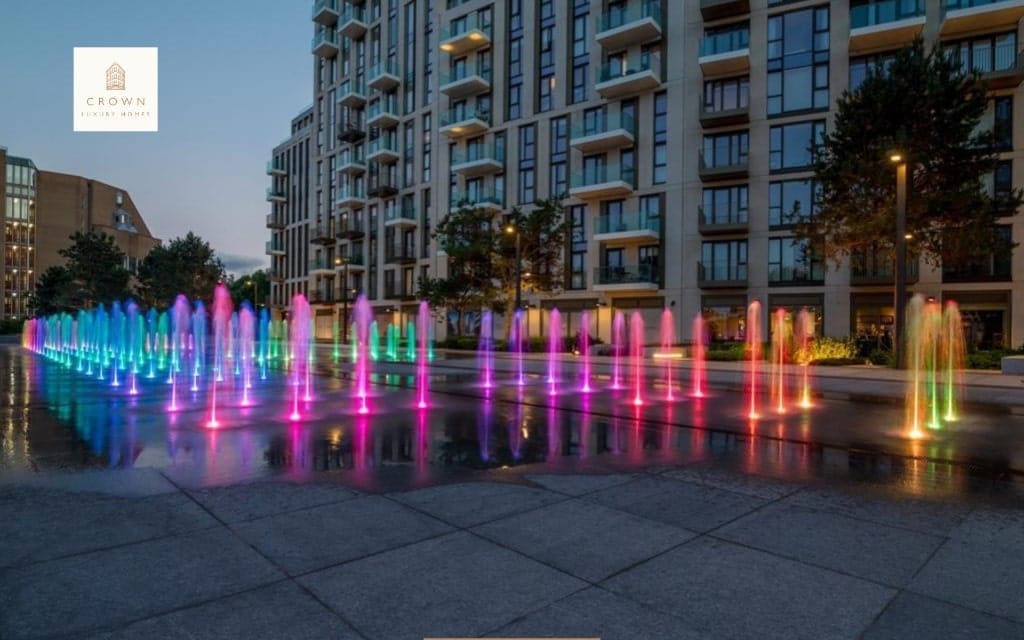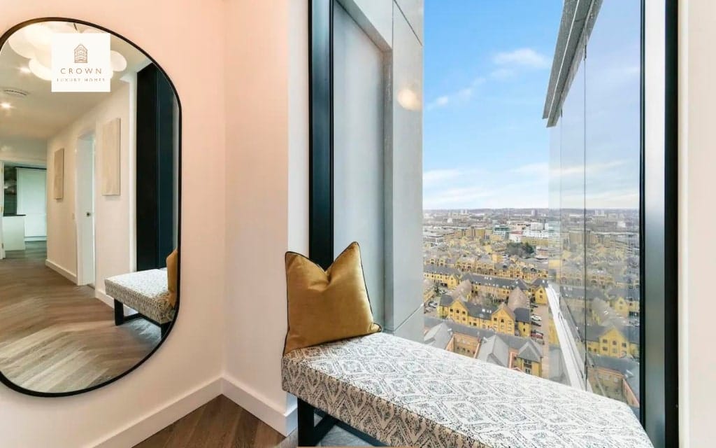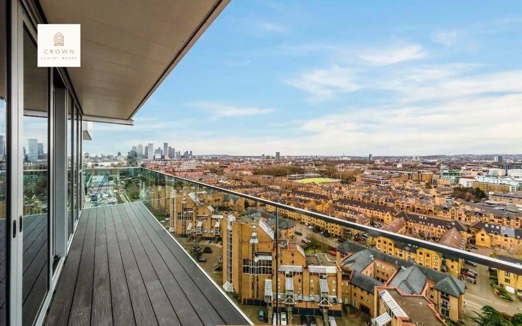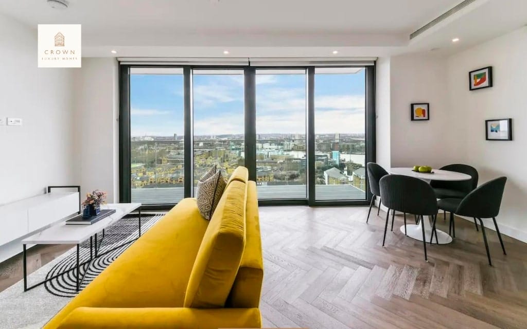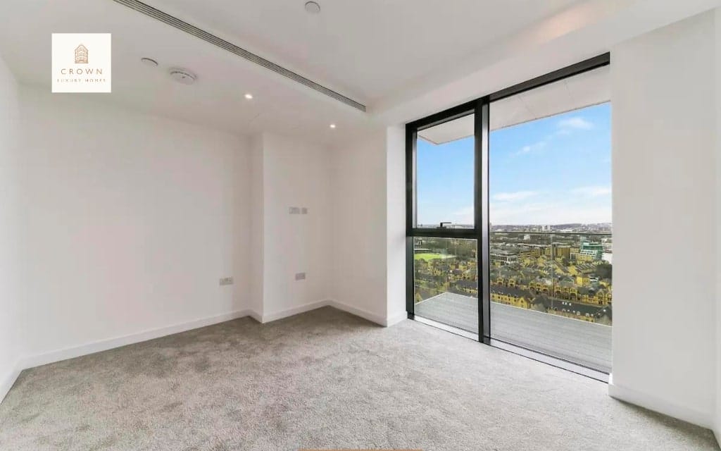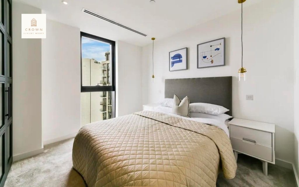 The expansive open living area seamlessly extends to a substantial balcony, providing sweeping views of the city, Shard, Canary Wharf, and Tower Bridge. This contemporary apartment is characterised by its distinctive features. The modern L-shaped kitchen is equipped with integrated appliances, including a Siemens induction hob, a wine fridge, a dishwasher, and a fridge/freezer. Noteworthy details such as gold-ironmongery fixtures and composite stone worktops contribute to an elegant aesthetic. The thoughtful integration of these elements results in a dynamic composition that optimally utilises light and space, creating a residence conducive to comfort and flourishing.