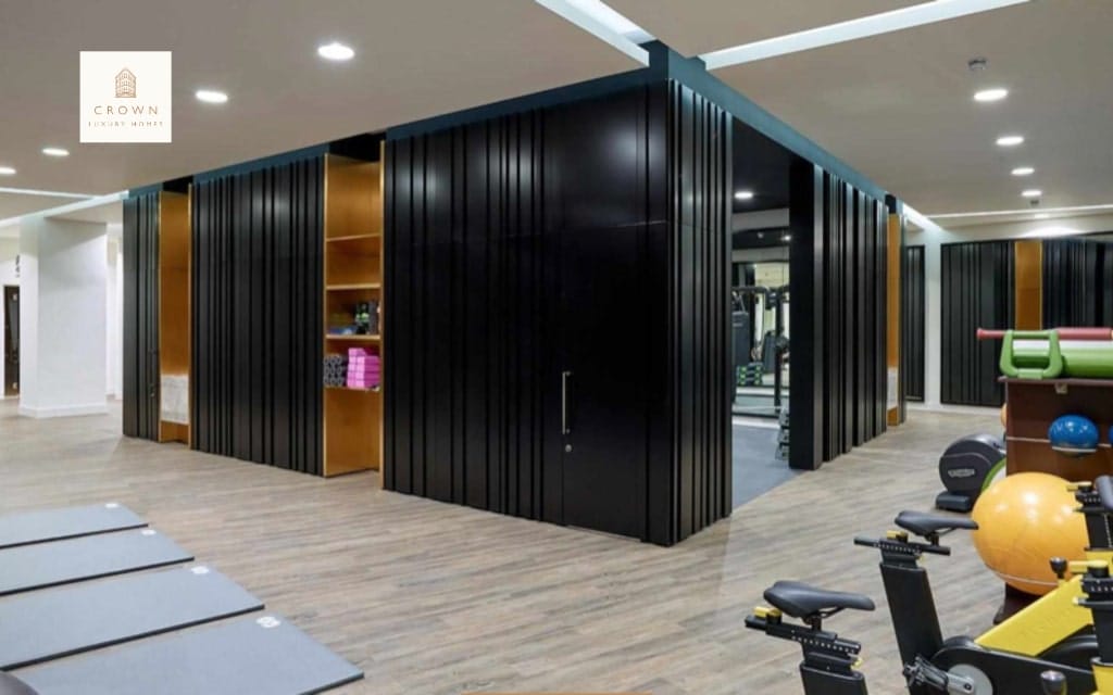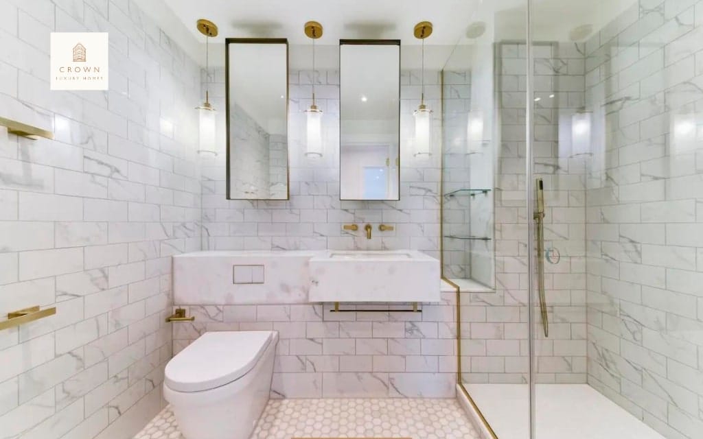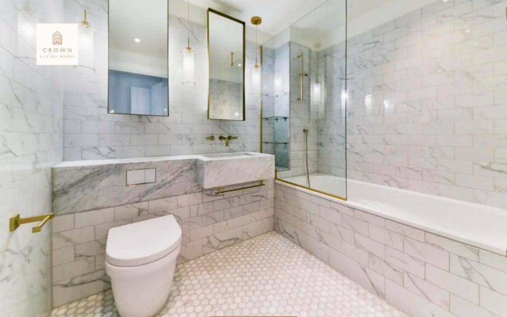 Each of the spacious bedrooms feature large windows ensuring abundant natural light, and there are built-in wardrobes in the main bedroom for organised storage. Privacy is assured with the main bedroom boasting its own en suite, complete with a bathtub, while a guest bathroom with a walk-in shower is conveniently located in the hallway. Both bathrooms exhibit refined features, including white marble tiling, gold fixtures, underfloor heating, and well-lit vanities with ample storage space.