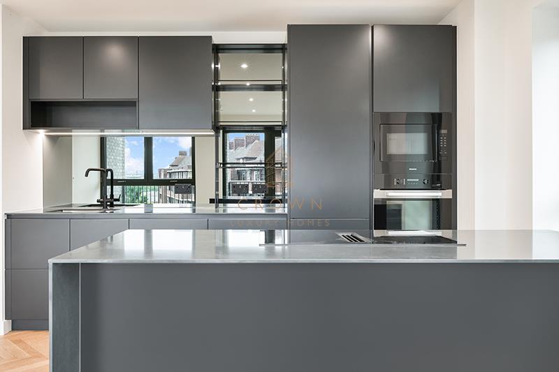 The expansive living area provides ample space to relax and opens onto a beautiful private balcony. The modern kitchen, finished in soft, neutral tones, includes high-end integrated Miele appliances and a stylish with kitchen island.