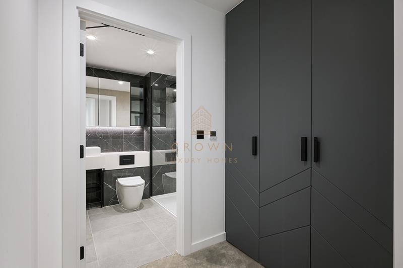 Both bedrooms are generously sized and benefit from large windows and a bright, airy feel. The main bedroom features fitted wardrobes and enjoys direct access to an en suite bathroom with a luxurious walk-in shower.