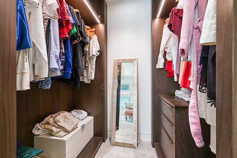The master bedroom is generously sized and features integrated walk-in wardrobes, providing excellent storage without compromising on style. It benefits from an en-suite bathroom finished to a high standard, with a walk-in shower, elegant black accents, and plenty of built-in storage — matching the design of the principal bathroom for a cohesive feel.