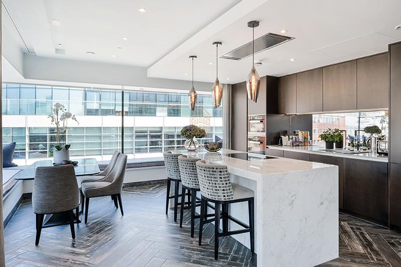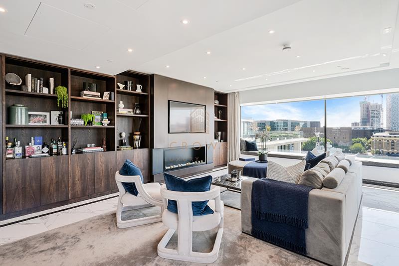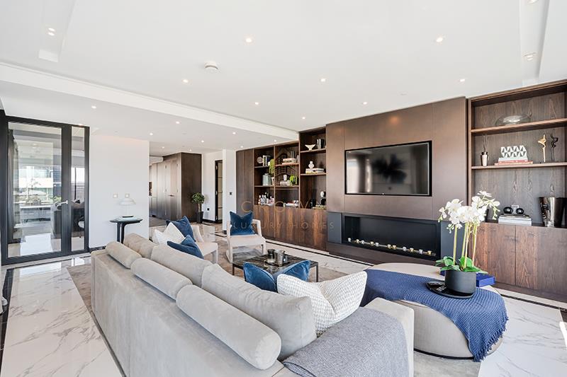 From the moment you enter, you’re welcomed into a bright, expansive living space designed with elegance and comfort in mind. Floor-to-ceiling windows wrap the lounge in natural light, while custom-made paneling, shelving, and fixtures elevate the room with a refined, bespoke finish. Thoughtfully integrated window seats invite you to soak in panoramic views of the River Thames, the Shard, and even the London Eye — a rare and ever-changing backdrop, day or night.