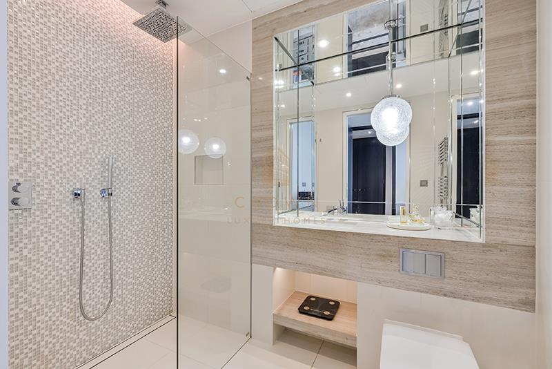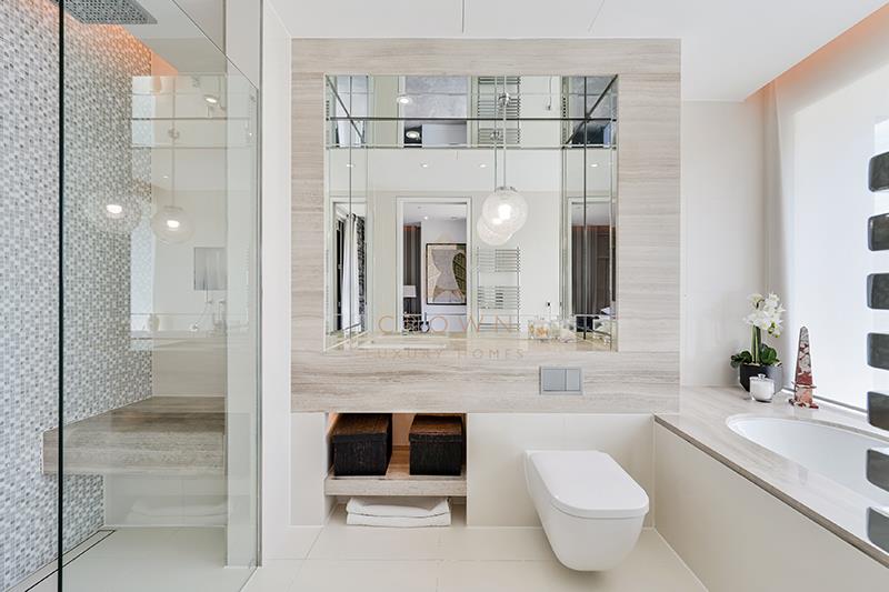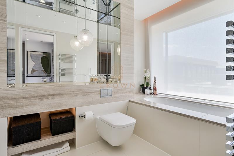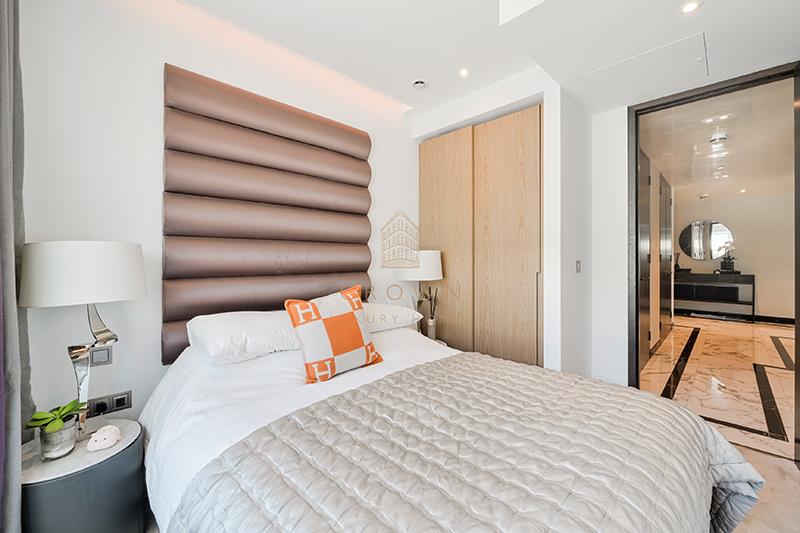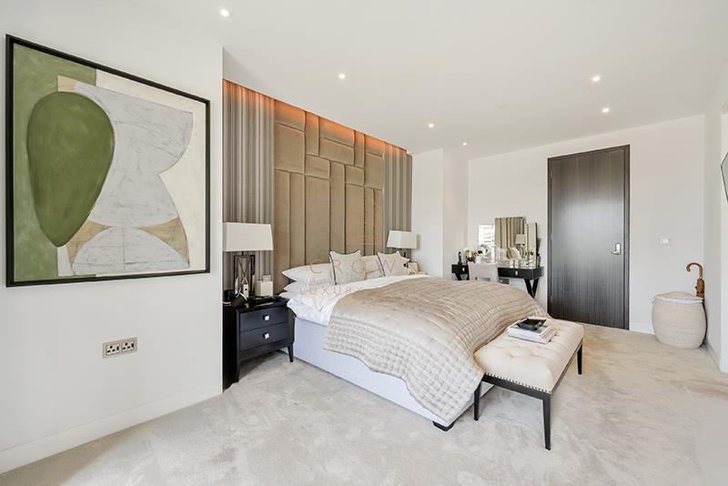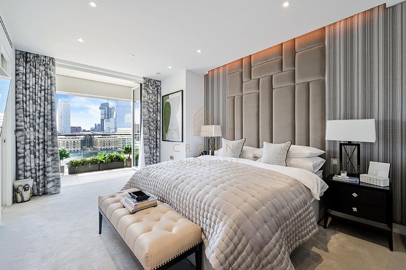 The master bedroom is a true sanctuary. Spacious and serene, it features a walk-in wardrobe, a luxurious en-suite bathroom with both a freestanding bathtub and a walk-in shower — all overlooking the River Thames. A second private balcony ensures you can enjoy the same stunning views from the comfort of your bedroom.