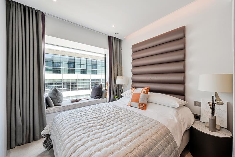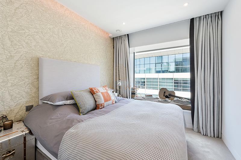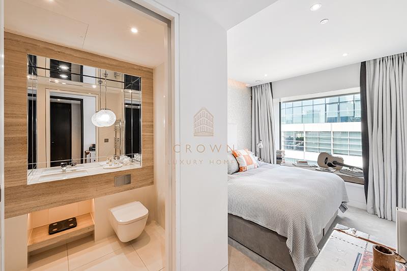 The second bedroom is equally well-appointed, complete with an en-suite bathroom featuring a walk-in shower, integrated wardrobes, and a window seat facing the City of London skyline.