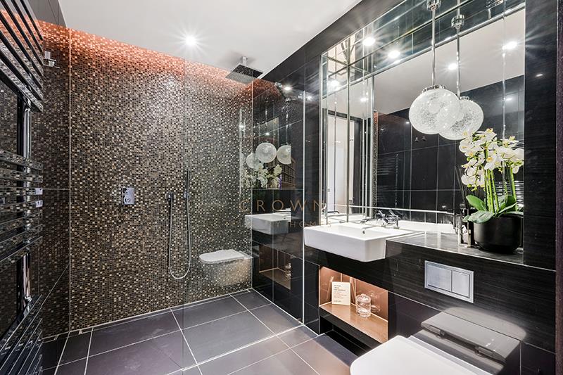 A beautifully finished family bathroom in deep, sophisticated tones includes a walk-in shower and mirrored cabinets, completing the layout with a touch of modern elegance.
