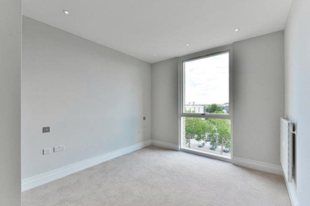 The living area leads to a balcony which is very generous in size with pleasant views. The bedroom is of a good size and features floor-to-ceiling windows, as well as integrated wardrobes.