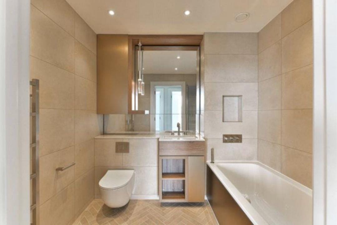 The bathroom is modern and cozy. The bathroom is fitted with a large bath tub, so you can de-stress and enjoy a relaxing bath. The bathroom also features plenty of storage via the vanity unit. The bathroom is also fitted with a heated towel rail.