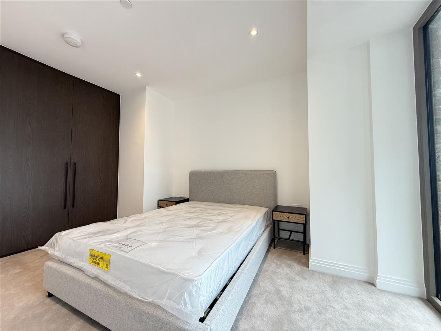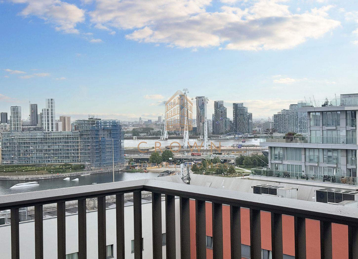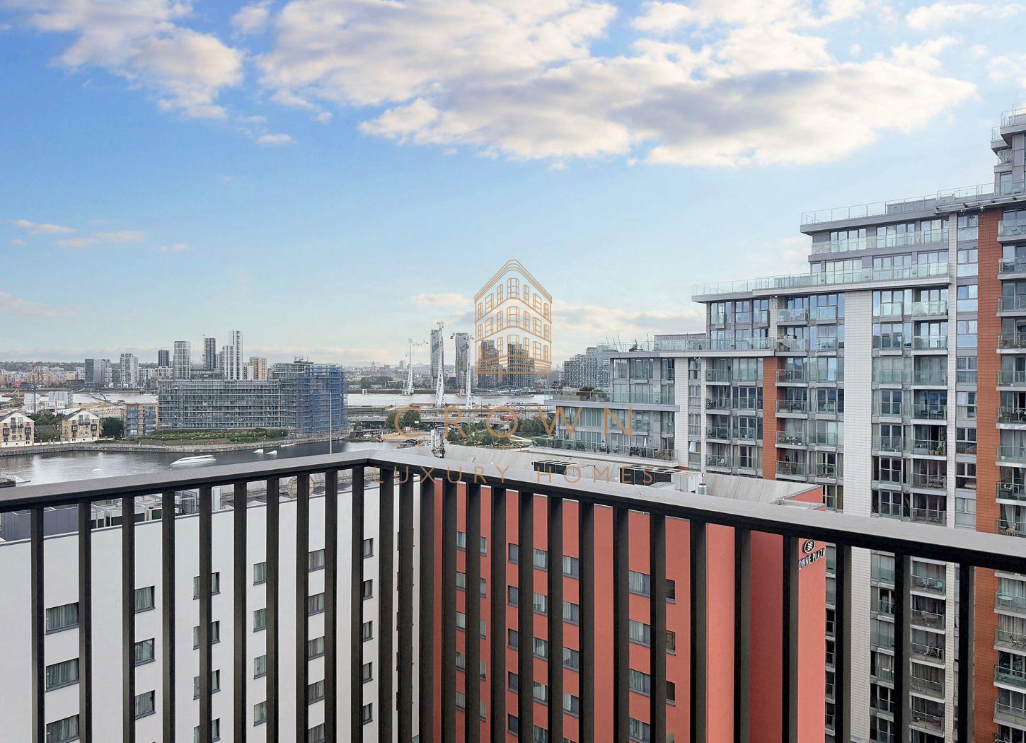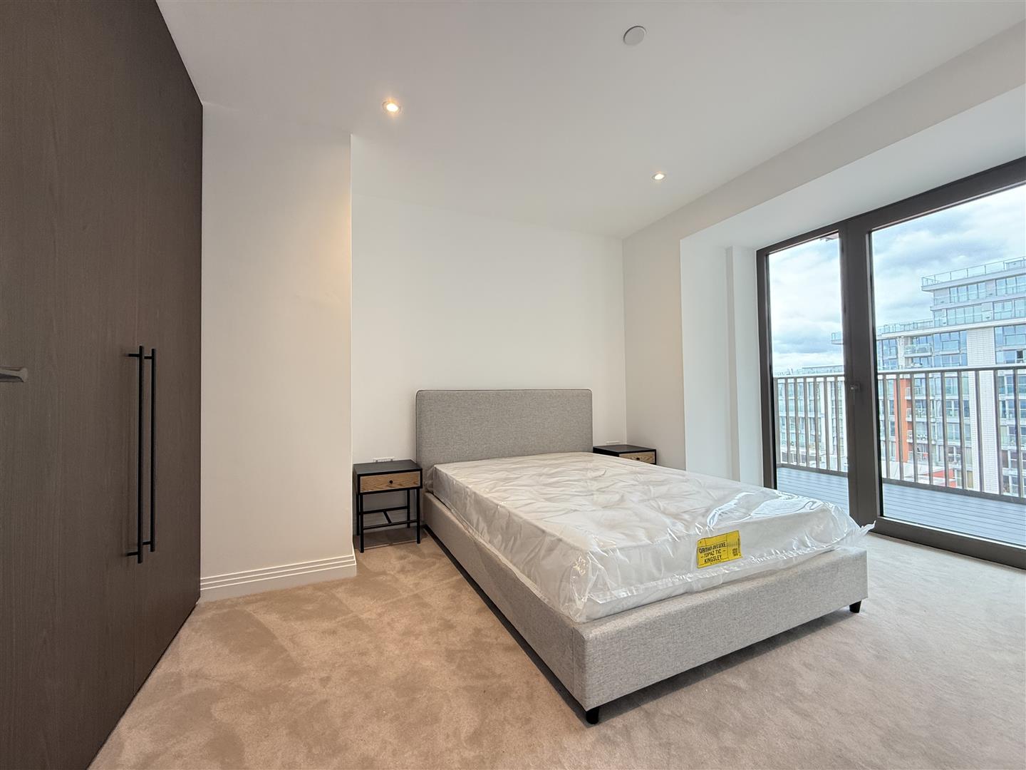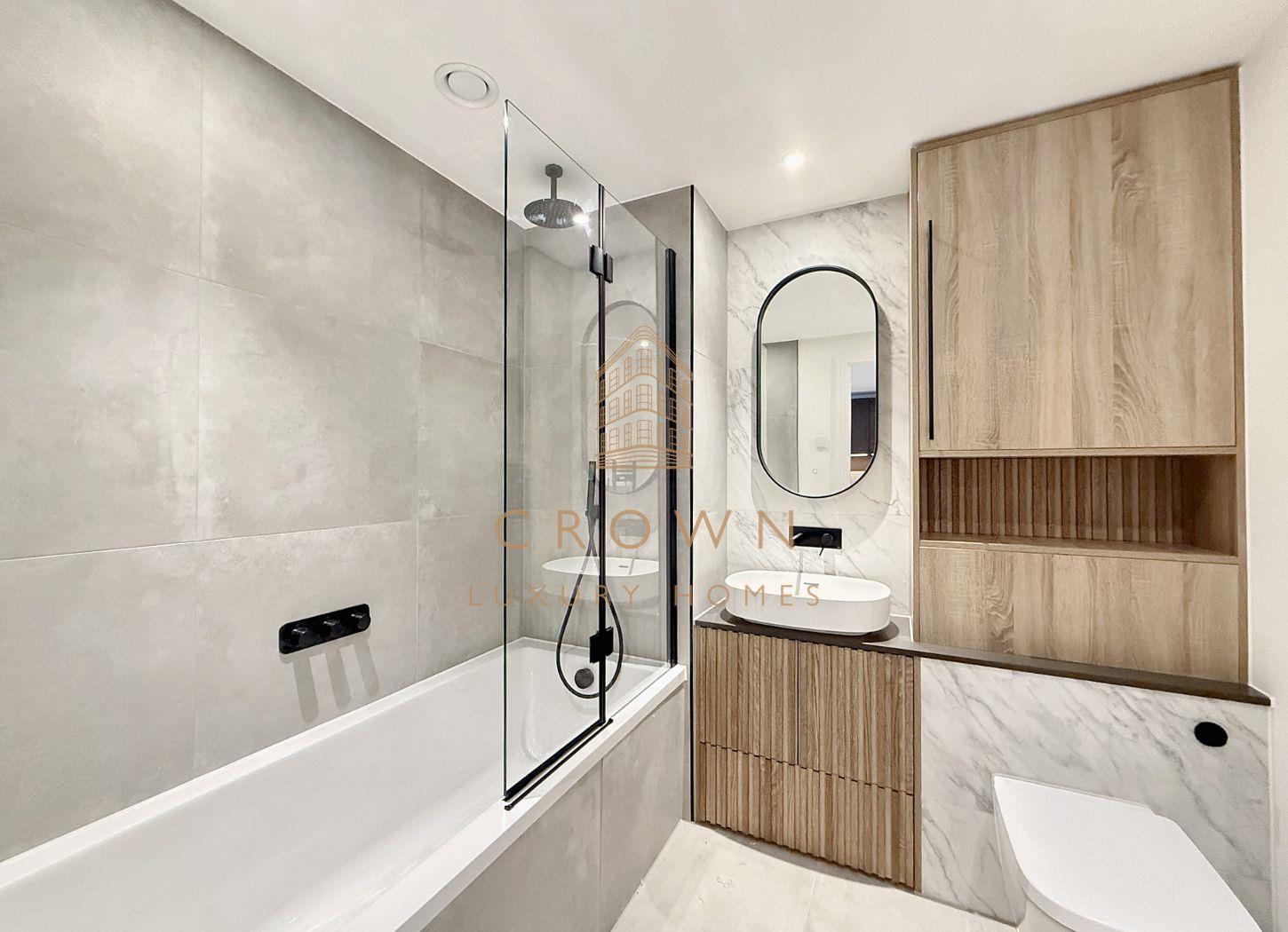 The bedroom provides a calm and welcoming retreat, complete with built-in wardrobes and direct access to a private balcony. From here, residents can enjoy peaceful outdoor moments with striking views of the River Thames and the iconic cable cars gliding across the skyline. The en-suite bathroom is finished to a high standard, featuring a full-size bathtub with an overhead shower, a modern vanity unit with storage, and elegant contemporary finishes.