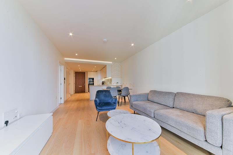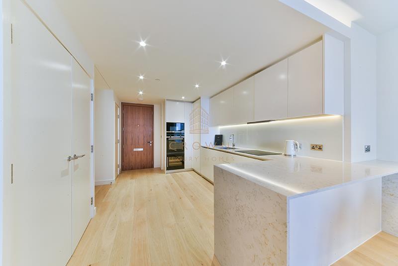 The expansive living and dining area creates a wonderful first impression, featuring incredible views across the Canary Wharf skyline. The large sliding window can be transformed into a Juliet balcony. An adjacent fully fitted kitchen has integrated Siemens appliances, a marble-effect countertop, a fridge/freezer, dishwasher, wine fridge, and an abundance of storage, making it highly functional and a pleasure to use. There’s also a breakfast bar to help you ease yourself into your day in style.