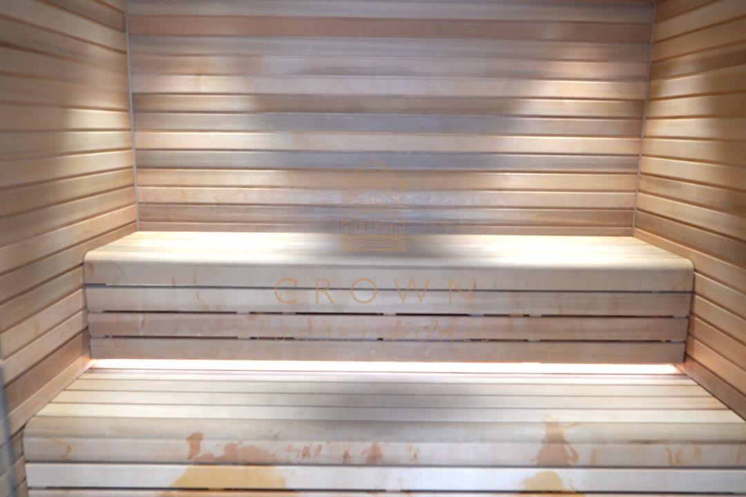 The large and bright bedroom has floor-to-ceiling windows as well as fitted wardrobes. The bathroom features a large bathtub with an overhead shower fitted in the ceiling, mirrored units, and the same flawless attention to detail. Meanwhile, comfort cooling and underfloor heating mean being able to maintain the temperature that’s exactly right for you throughout each room of this remarkably crafted property. There’s cupboard space that can be used as a cloakroom, plus extra space to house your washer/dryer.