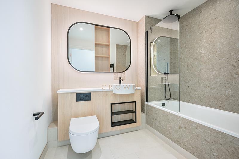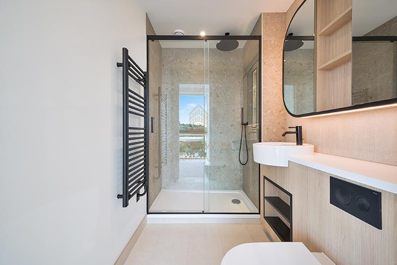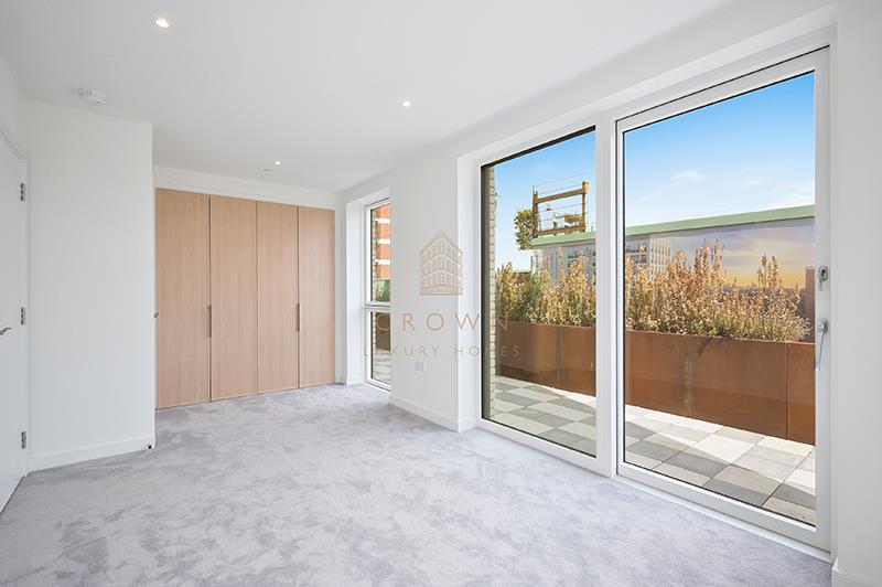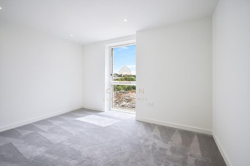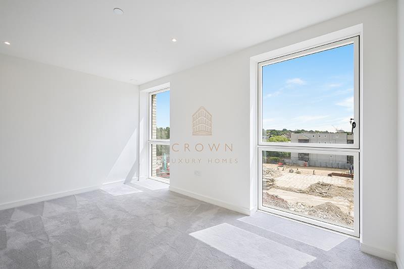 The principal bedroom is generously sized, featuring floor-to-ceiling windows, built-in wardrobes, and a contemporary en-suite bathroom finished to a high standard.