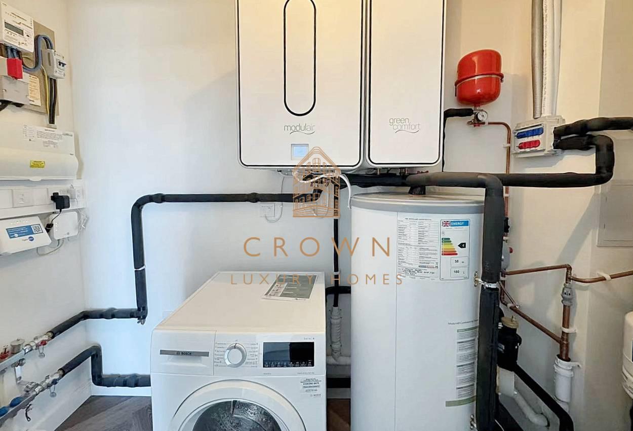 The kitchen is both stylish and functional, finished in a refined green and white palette. It comes fully equipped with high-spec Bosch appliances, including an oven, microwave, wine cooler, dishwasher, and fridge/freezer—seamlessly integrated to complement the sleek design.