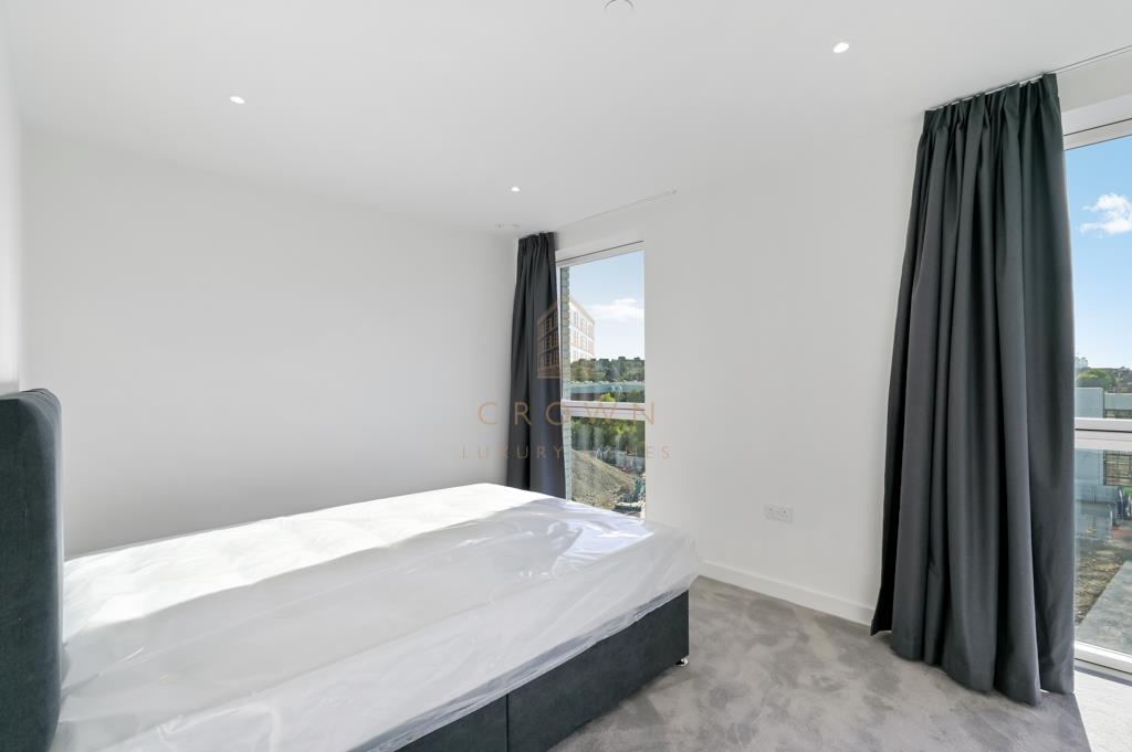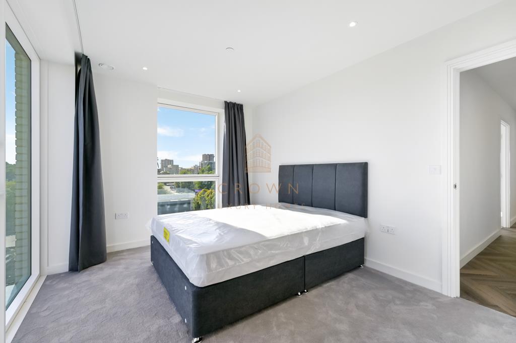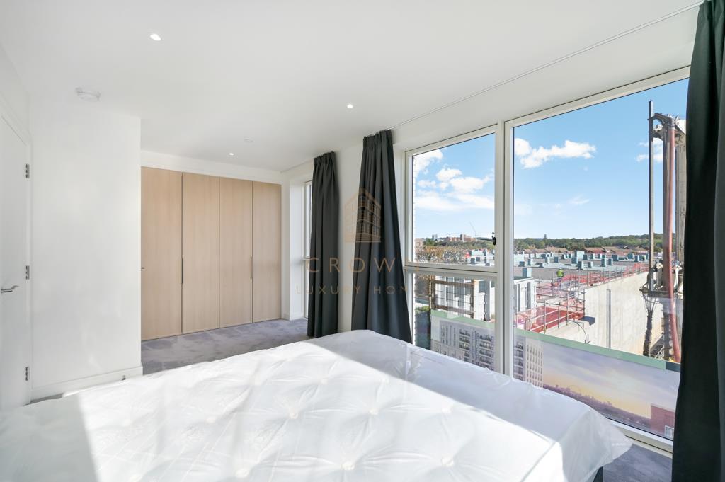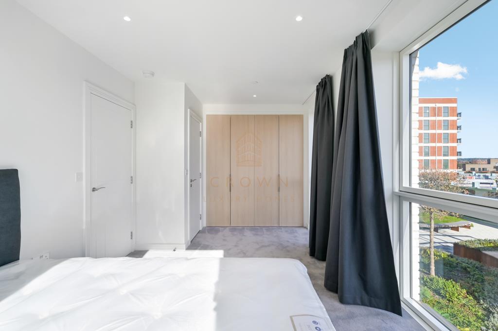 The principal bedroom is spacious and serene, featuring full-height windows, built-in wardrobes, and a sleek en-suite bathroom finished to a high standard.