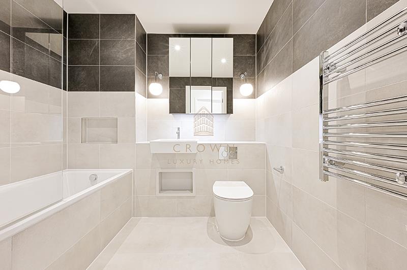 The main bathroom is finished to a high standard, featuring a full-size bathtub with overhead shower, soft lighting, a modern vanity unit, and a mirrored cabinet offering practical storage in a refined setting.
