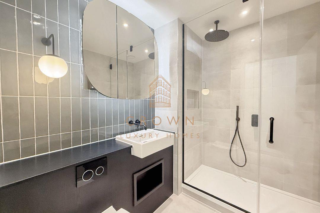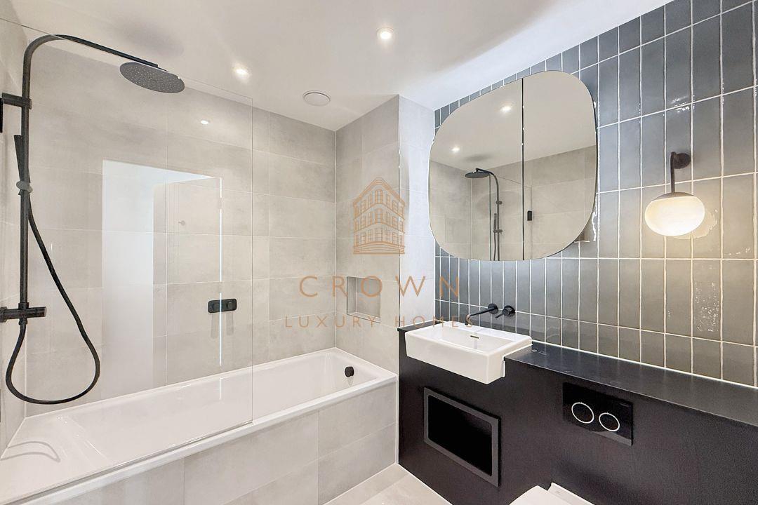The main bathroom continues the apartment’s sophisticated design, with a full-size bathtub, overhead shower, ambient lighting, and mirrored cabinetry that balances practicality with elegance.