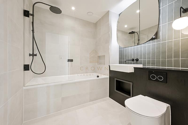 The principal bedroom is a private haven, designed for rest and retreat, with built-in wardrobes and a beautifully appointed en-suite bathroom. A walk-in shower, clean lines, and polished finishes give it a calm, spa-like ambience.