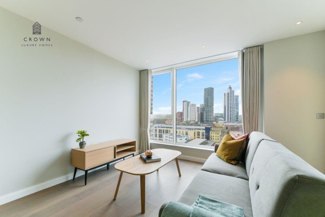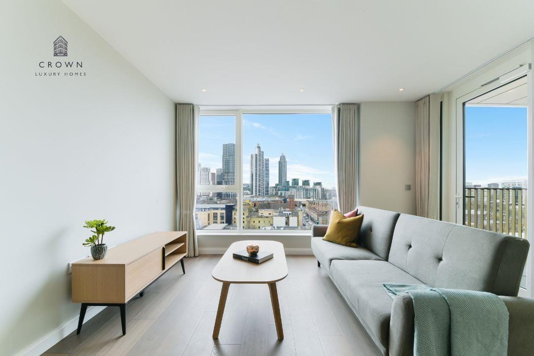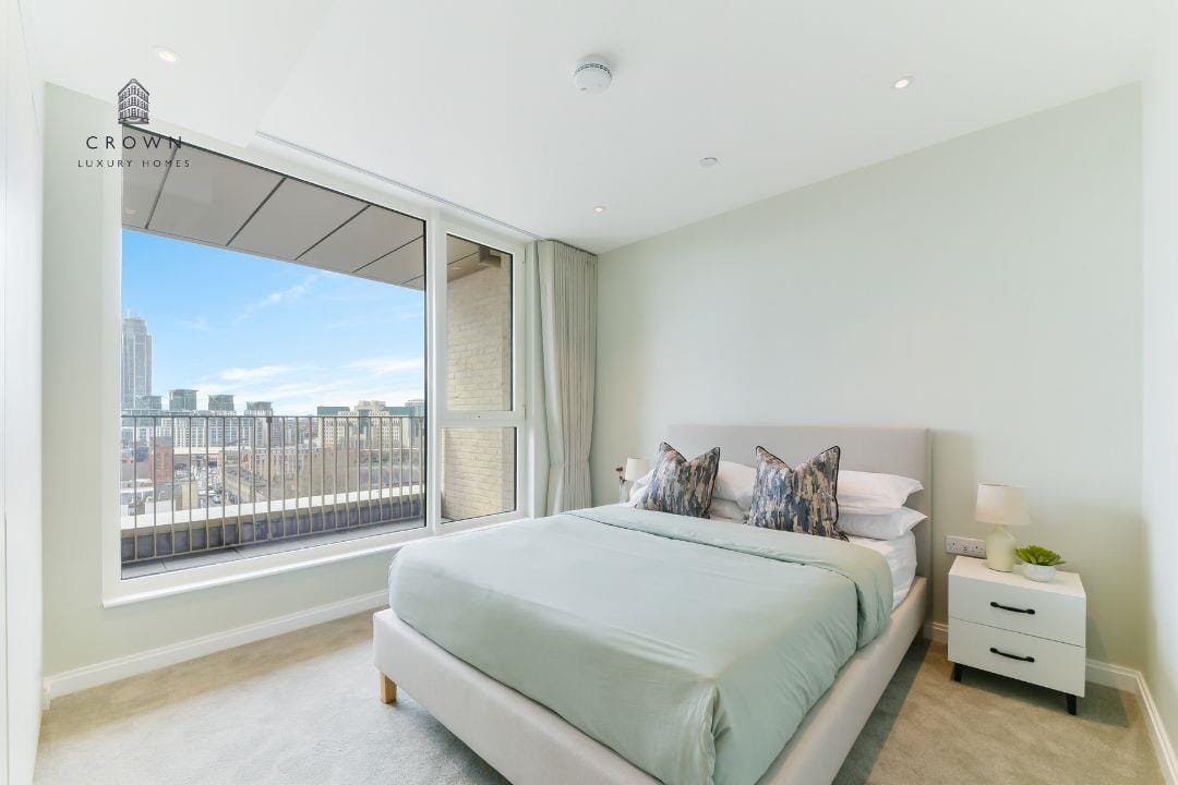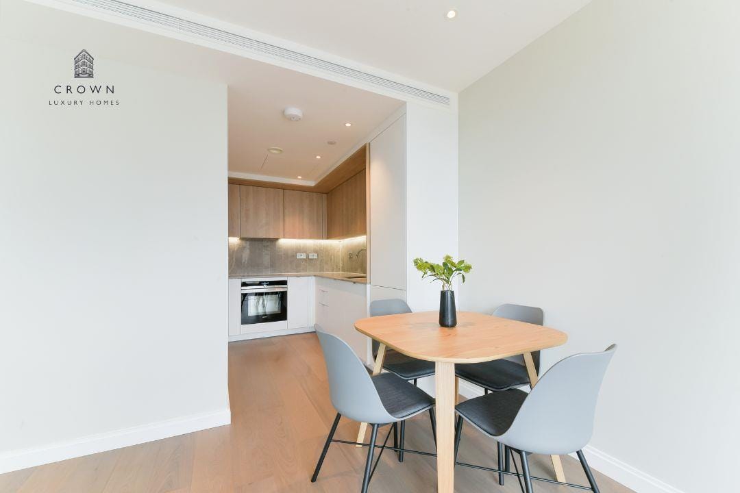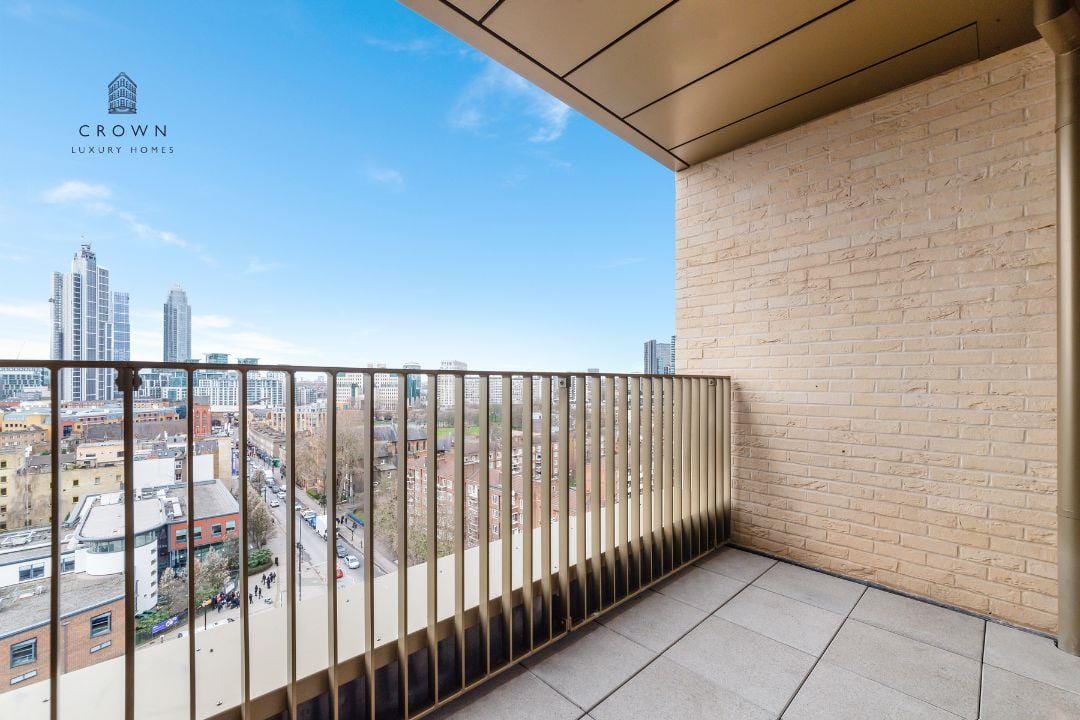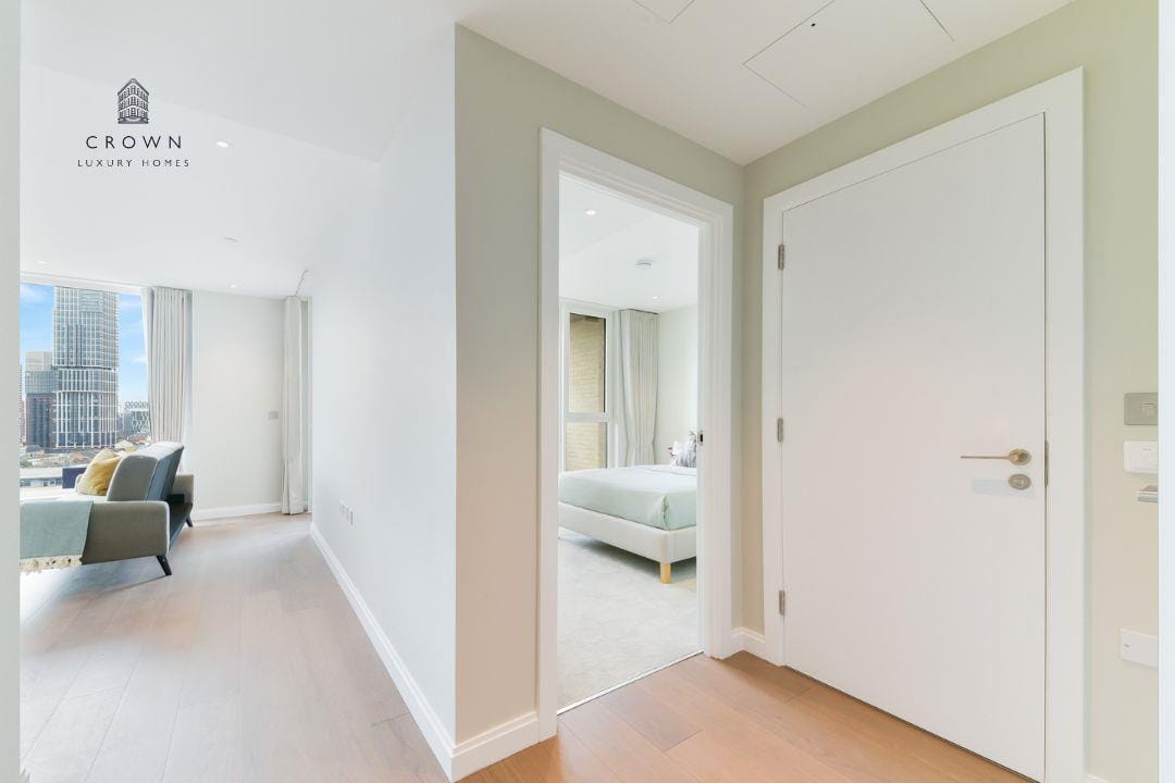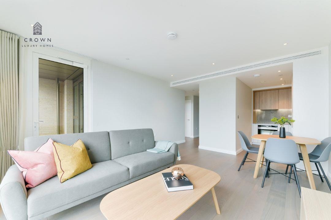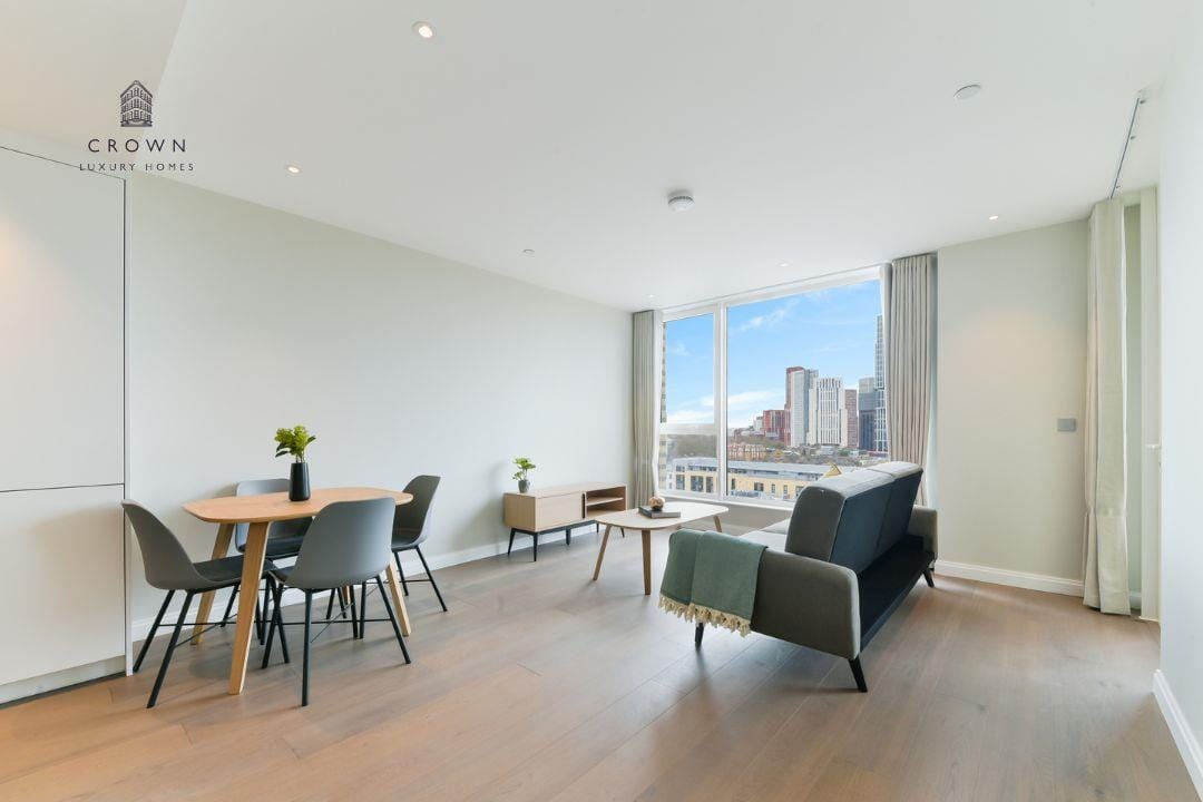Step into the stylish living area, boasting expansive windows that flood the space with natural light and offer breathtaking views of London from the balcony. With its elegant wood floors, the atmosphere is both refined and inviting, providing a serene escape high above the bustling city below. The balcony itself is perfect for entertaining guests or enjoying moments of solitude any time of day or night.