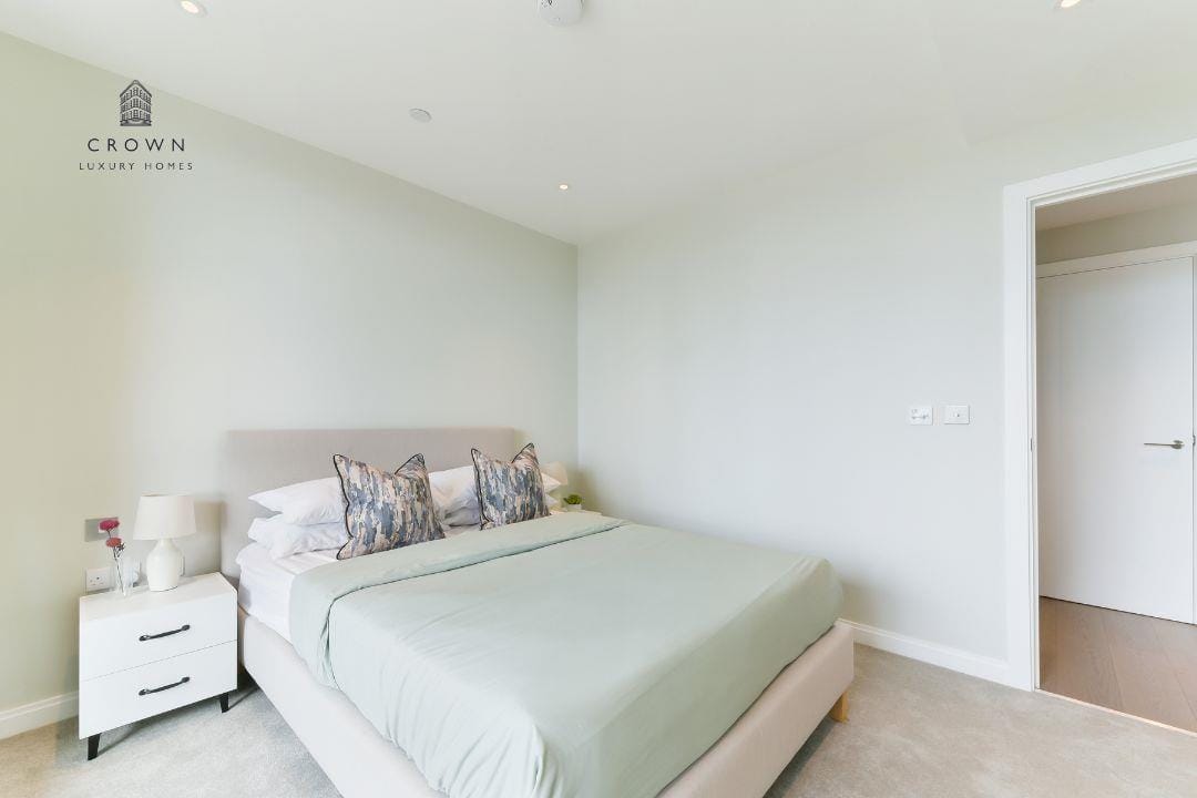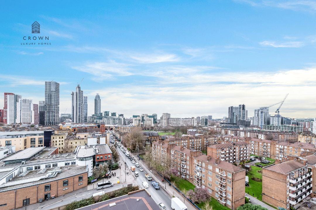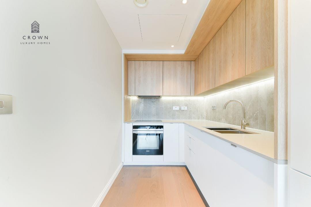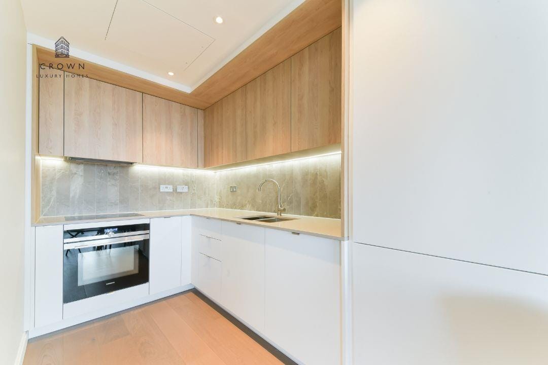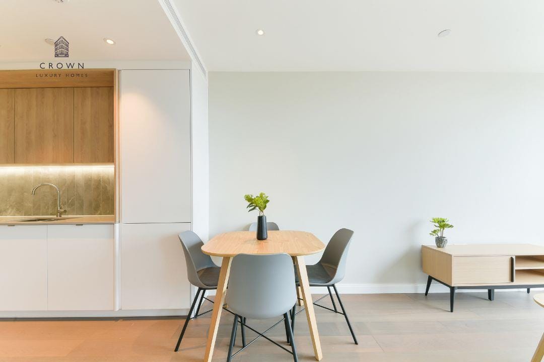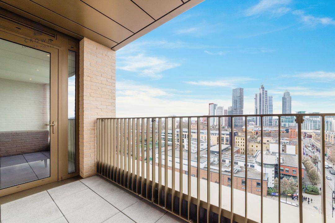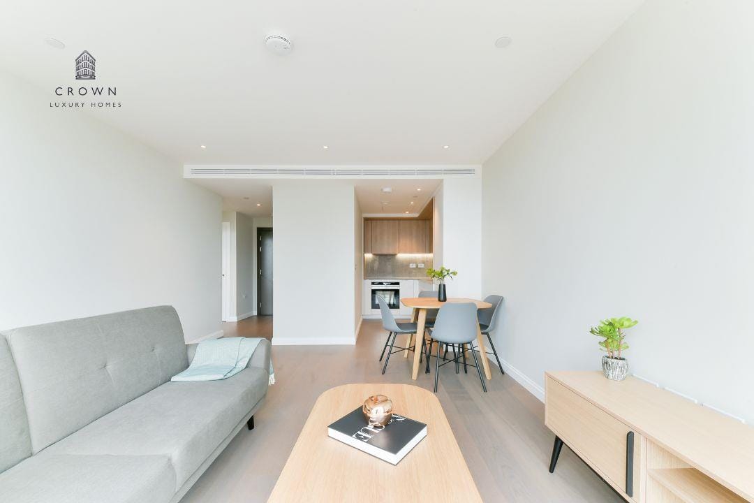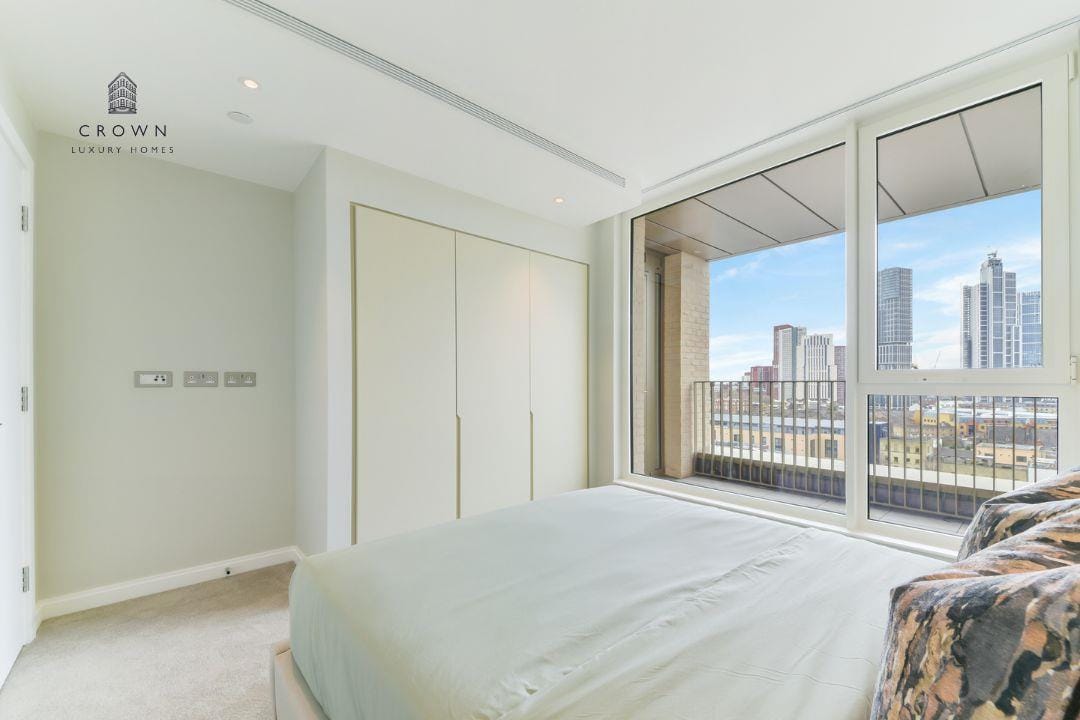 Step into the stylish living area, boasting expansive windows that flood the space with natural light and offer breathtaking views of London from the balcony. With its elegant wood floors, the atmosphere is both refined and inviting, providing a serene escape high above the bustling city below. The balcony itself is perfect for entertaining guests or enjoying moments of solitude any time of day or night.
