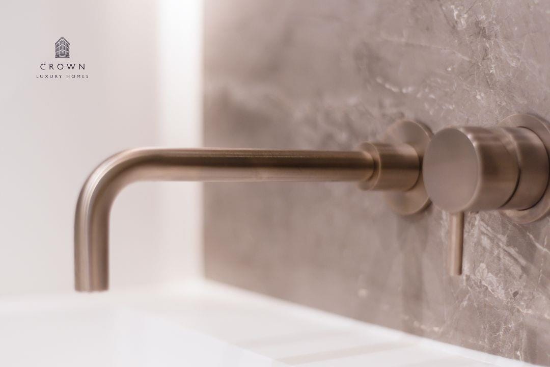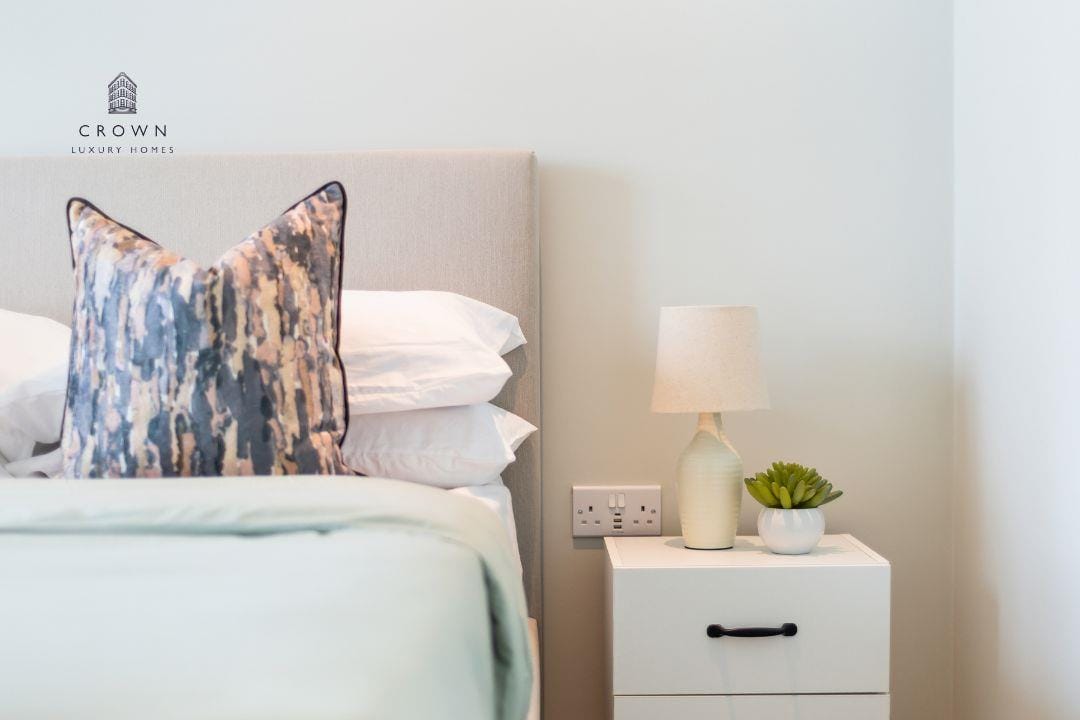 The spacious bedroom continues the theme of luxurious comfort, featuring ample natural light and a large utility cupboard for additional storage. The bathroom is a masterpiece of design, boasting a generous tub, overhead shower, mirrored units, and a classic marbled finish that complements the apartment's overall aesthetic.