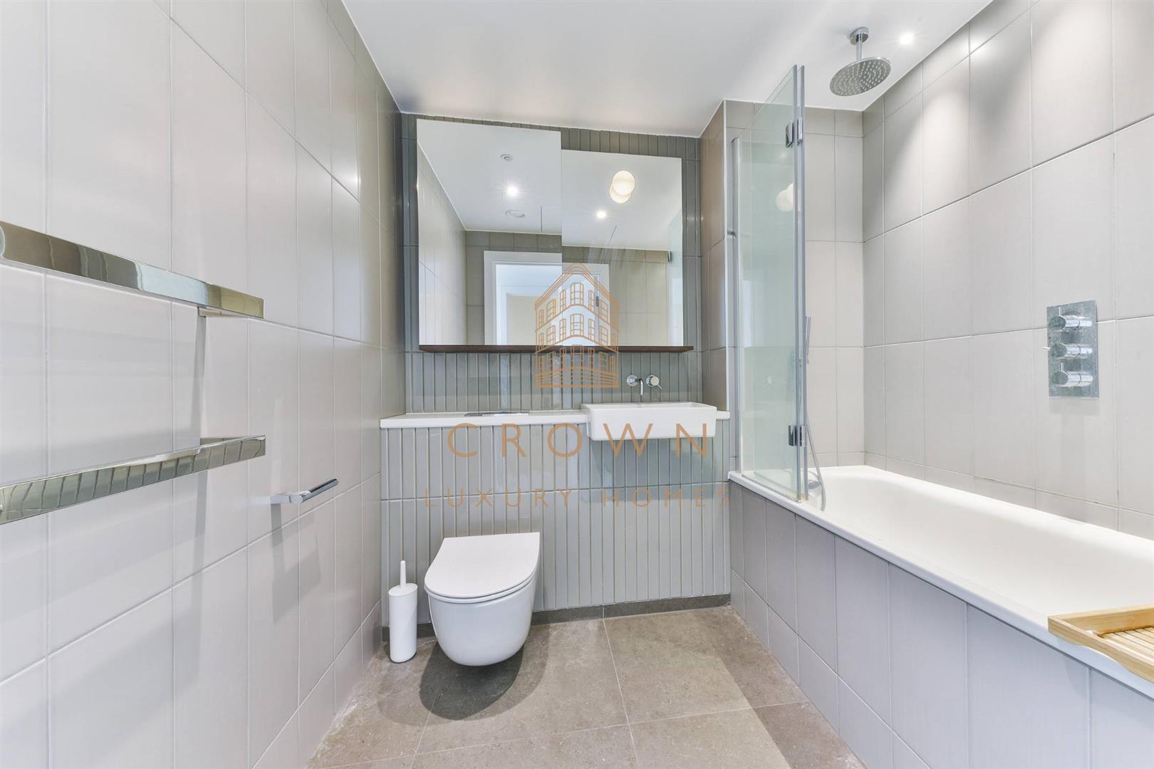 Both bedrooms are a great size, featuring warm carpet, fitted wardrobes and a Juliet balcony. The bathrooms are finished to perfection, one with a large tub and another one with a walk-in shower, wall-mounted vanity units, white ceramic basins and classic grey tiling throughout.