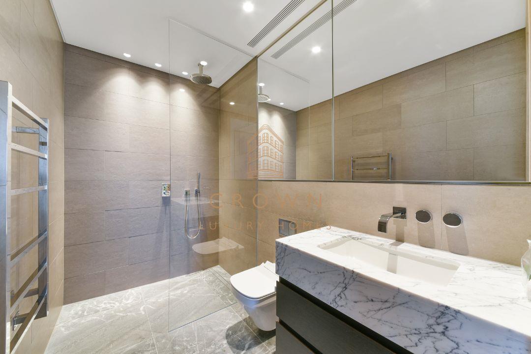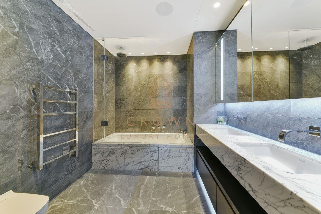 This property also boasts two generously-sized, immaculately finished bedrooms, each with fitted wardrobes. The primary bedroom offers access to a luxurious en-suite bathroom adorned with traditional marble tiles, complete with a spacious tub, an overhead shower, and a well-lit vanity unit. Adjacent to the second bedroom, the second bathroom is equally impressive, featuring a walk-in shower and ample storage within the mirrored vanity unit.