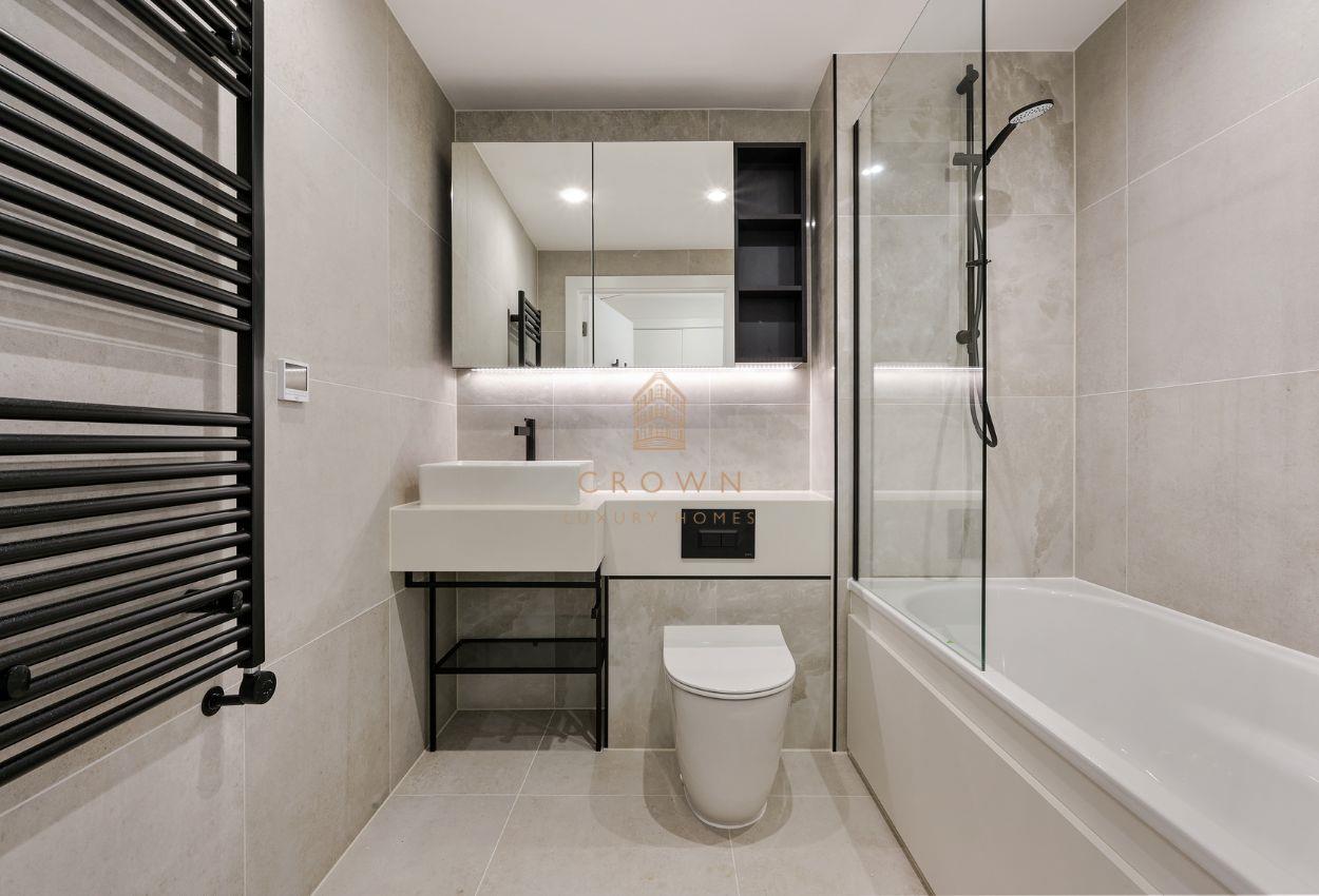 The bathroom exudes luxury with its elegant color palette and refined finishes. Offering both a bathtub and a shower, it delivers the best of both worlds for relaxation and convenience.
