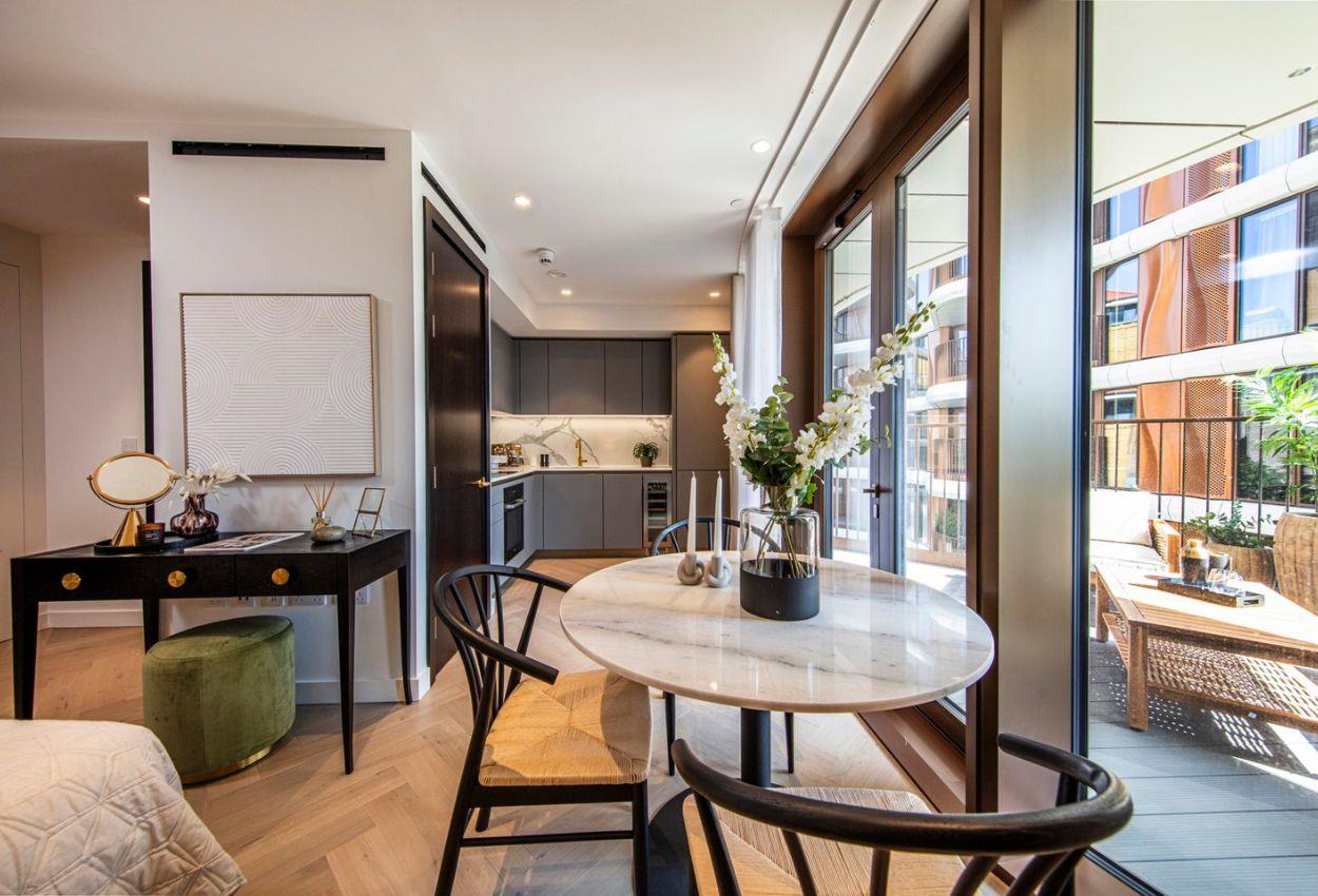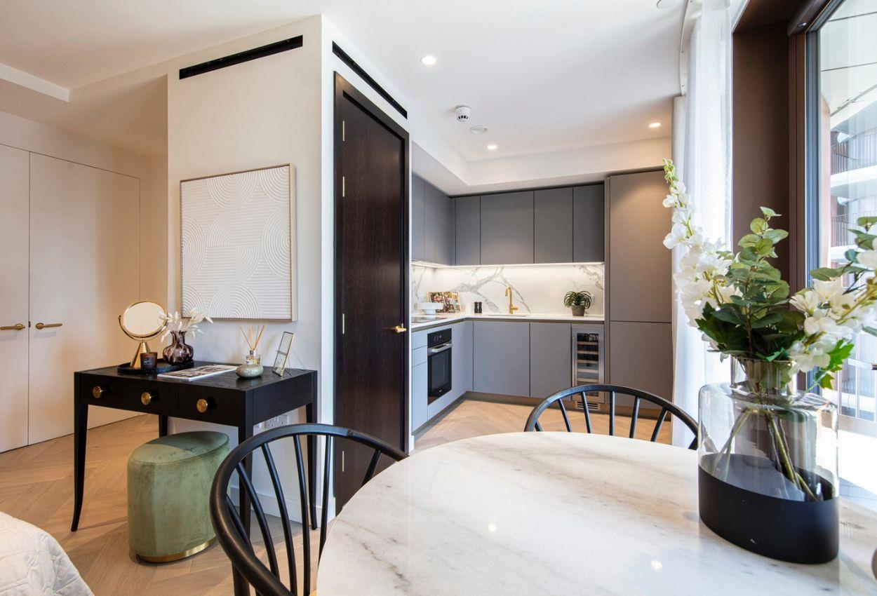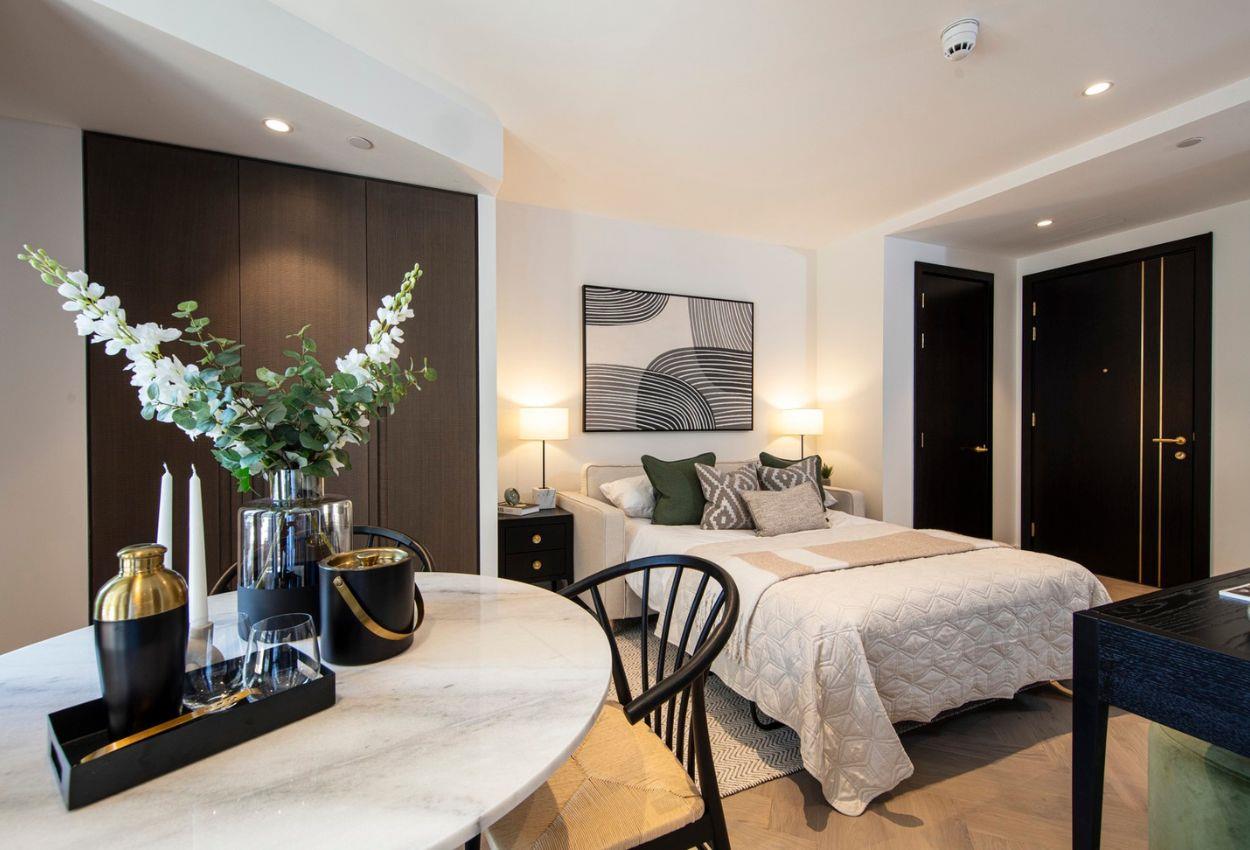 This beautifully designed studio apartment at Triptych Bankside offers a contemporary and practical layout, ideal for modern city living. Floor-to-ceiling windows allow natural light to pour into the space, while the private balcony provides a charming outdoor retreat with gorgeous views of The Shard and the surrounding Southbank neighbourhood.
