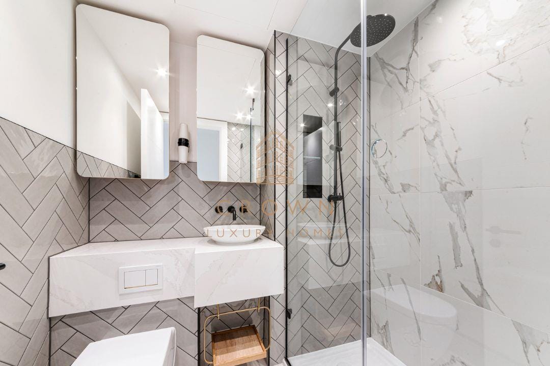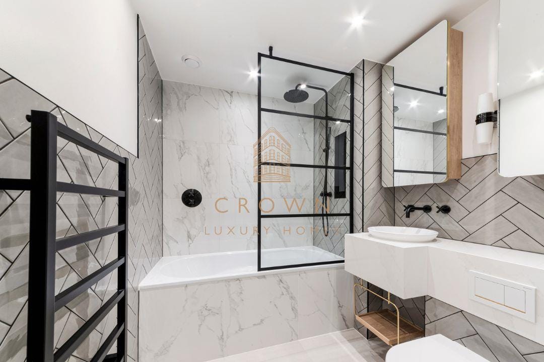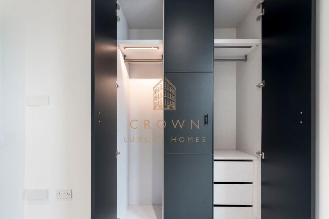 The bathroom includes marble tiling, overhead showers, heated tower rails, and vanity units with LED lighting and storage. There is enough of storage around the apartment for all of your possessions to be put away for a cleaner look.