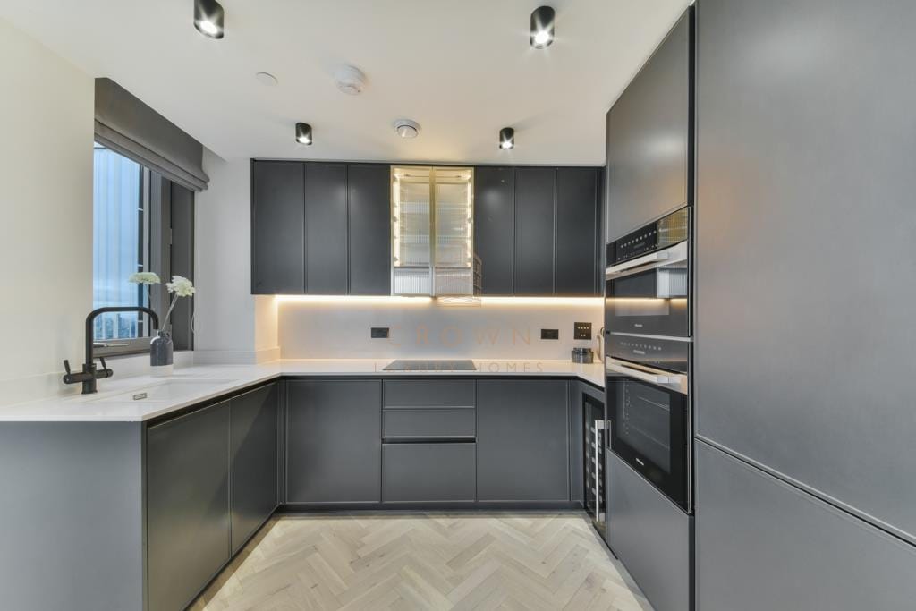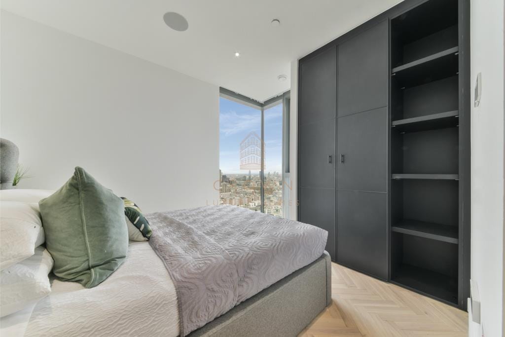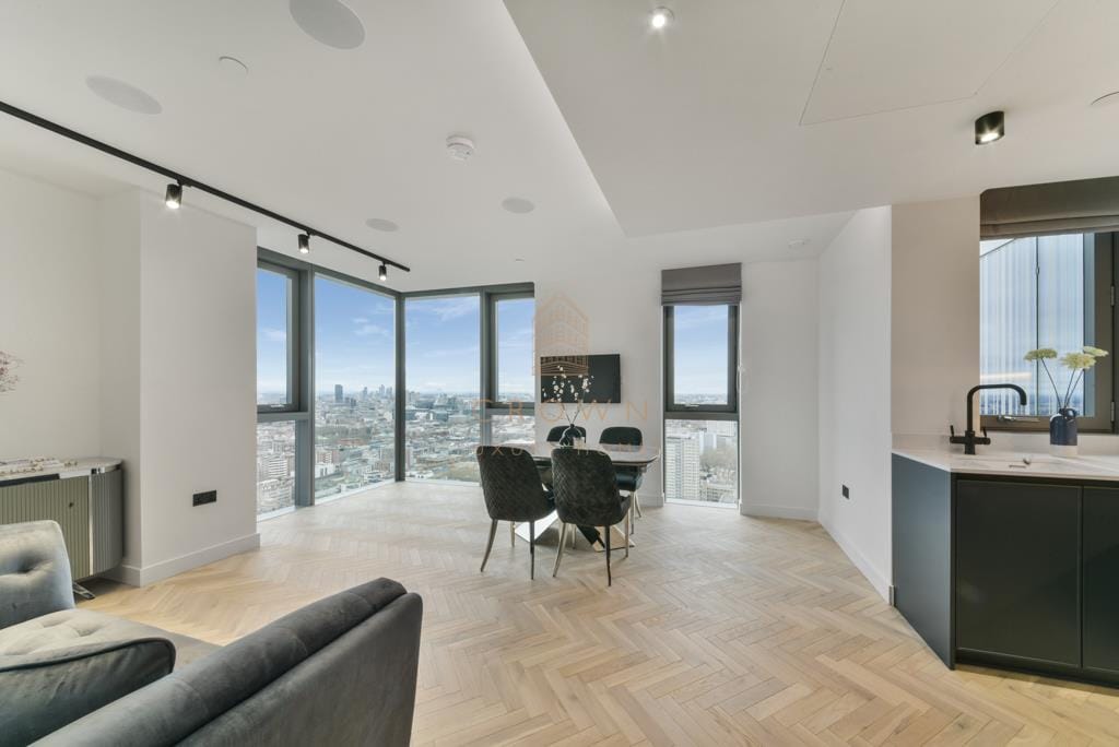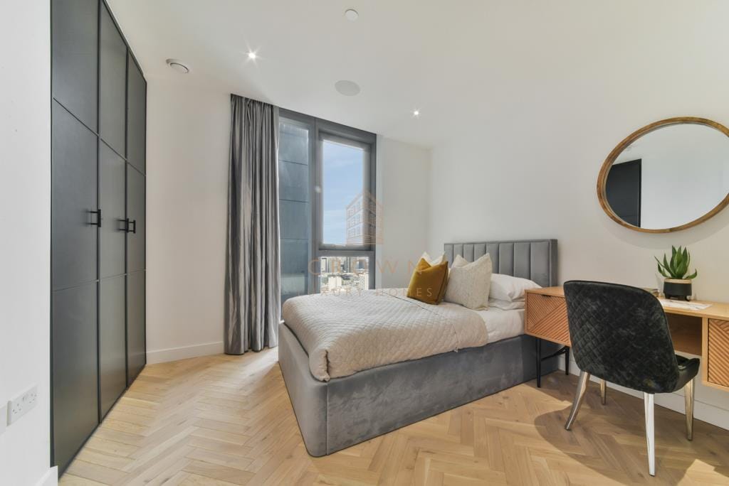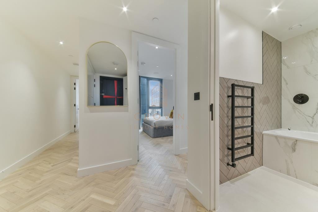 The home is bathed in sunlight thanks to its expansive floor-to-ceiling windows. With an open-plan layout, the kitchen and living room provide flexibility and showcase stunning vistas of London comparable to those found in the city's most renowned spots. Throughout the living spaces, engineered wooden flooring creates a cohesive link between rooms, ensuring a smooth transition. The kitchen, fully integrated and adorned with a wine fridge and elegant cabinetry, exudes luxury and sophistication. Each bedroom boasts ample proportions, complete with built-in wardrobes and ample storage to accommodate your possessions.