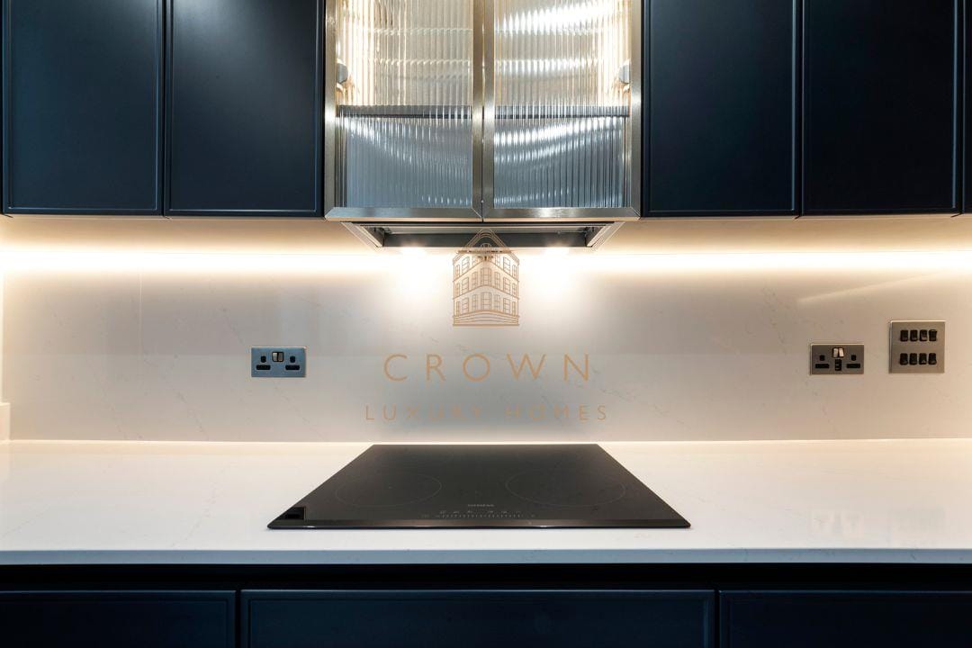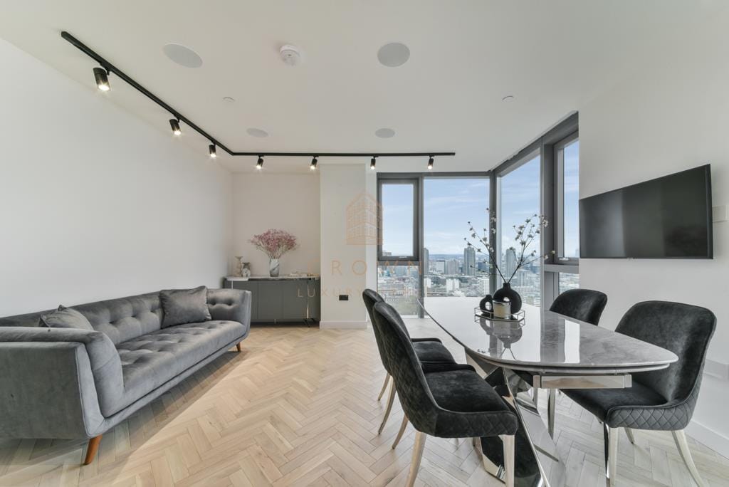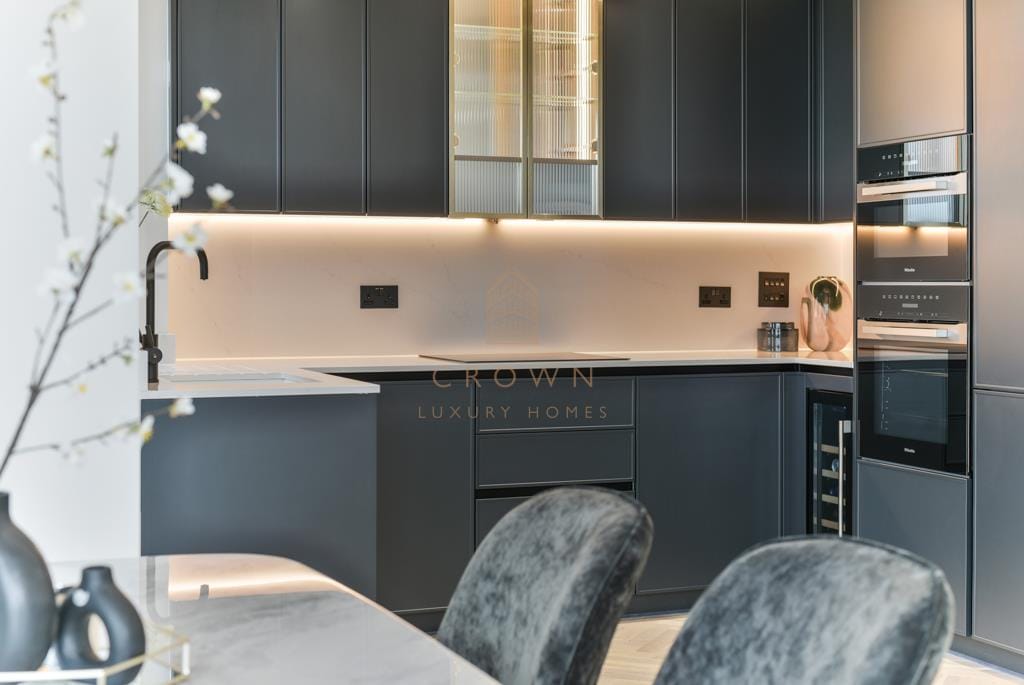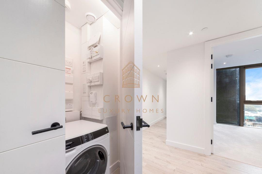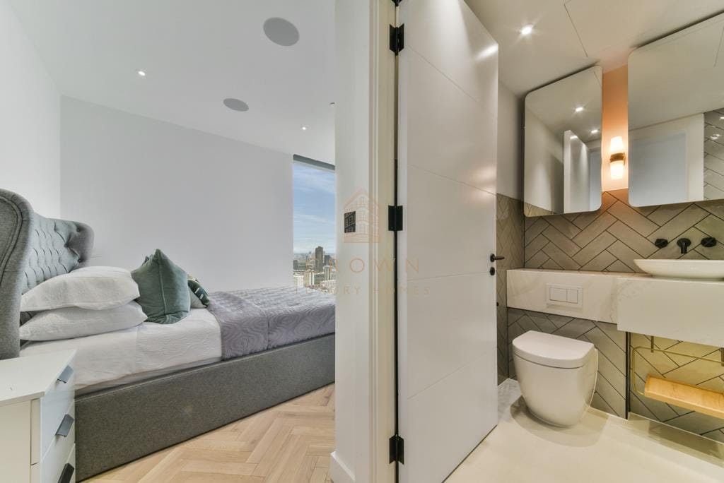 The home is bathed in sunlight thanks to its expansive floor-to-ceiling windows. With an open-plan layout, the kitchen and living room provide flexibility and showcase stunning vistas of London comparable to those found in the city's most renowned spots. Throughout the living spaces, engineered wooden flooring creates a cohesive link between rooms, ensuring a smooth transition. The kitchen, fully integrated and adorned with a wine fridge and elegant cabinetry, exudes luxury and sophistication. Each bedroom boasts ample proportions, complete with built-in wardrobes and ample storage to accommodate your possessions.